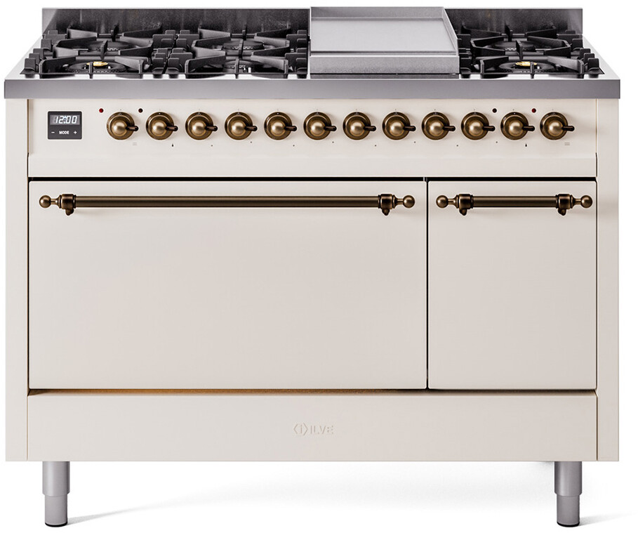 Freestanding Dual Fuel Range with 8 Sealed Burners, 5.02 cu. ft. Total Capacity, Storage Drawer, and Griddle: Antique White, Bronze Trim. Enjoy maximum versatility and control with eight sealed burners, perfect for everything from delicate simmering to high-heat searing. With a spacious 5.02 cubic feet oven capacity, you can easily accommodate multiple dishes simultaneously, making it ideal for large families and entertaining. Keep your kitchen organized with the convenient storage drawer, providing extra space for cookware and accessories. The included griddle offers a large, flat cooking surface, perfect for pancakes, sandwiches, and more, adding versatility to your cooking options. With power up to 25000 btu as standard. Optimal supply and perfect distribution of the heat, for all types of cooking. With non-stick nanotechnological treatment. The noble technical characteristics of brass are enriched with a nanotechnological coating that assures easy cleaning, with an elegant Total Black finish. Structure in AISI 304 steel with 12/10 thickness, option to choose the ideal combination between a gas hob with up to 9 burners or induction, mixed and in various setups. The indestructible cast iron pan supports provide a functional and safe support for the pots. The electronic control ensures that the temperature of the oven remains constant throughout, without fluctuating, as is the case in conventional ovens. It can be set with precision starting from 85F, for perfect proofing, up to 575F, for roasting. The door hinges are fitted with a shock absorber that makes the closure more gradual and noiseless. The quick oven preheating function allows it to reach the desired temperature in a short time and you can then choose the best-suited cooking mode for the dish. It also works as rapid defrosting when a low temperature is set (85F - 105F). Pizza function. Quick start. Multiple fan cooking. Intensive cooking. Fan grill cooking. Grill cooking with closed-door. Cooking from above. Cooking from below. Static normal cooking. Grill cooking with closed-door. Cooking from above. Cooking from below. Static normal cooking. Series: Nostalgie II. Fuel Type: Dual Fuel. Gas Type: Natural Gas. Installation Type: Freestanding. Oven Total Capacity (cu. ft.): 5.02. Sabbath Mode: No. Number of Racks: 2. Drawer Type: Storage Drawer. Display Type: LCD Display. Timer: Yes. Cooking Probe: Yes. Rotisserie: Yes. Soft Close Door: Yes. Cooktop Configuration: 8 Sealed Burners + Griddle. Burner/Element Type: Sealed Burner. Griddle: Yes. Grill: No. Oven Control Type: Knobs. Oven Door Type: Solid Door. Number of Ovens: Double Oven. Main Oven Capacity (cu. ft.): 3.5. Second Oven Capacity (cu. ft.): 1.52. Oven Cleaning Type: Easy Clean Enamel Cavities. Main Oven Type: UOV 80 M. Second Oven Type: UOV 30 E. Voltage: 240 V. Amps: 25.8 A. ADA Compliant: No. Star-K Certified: No. Width: 47 7/8". Depth: 25". Height: 38 1/2". Exterior Width: 48".