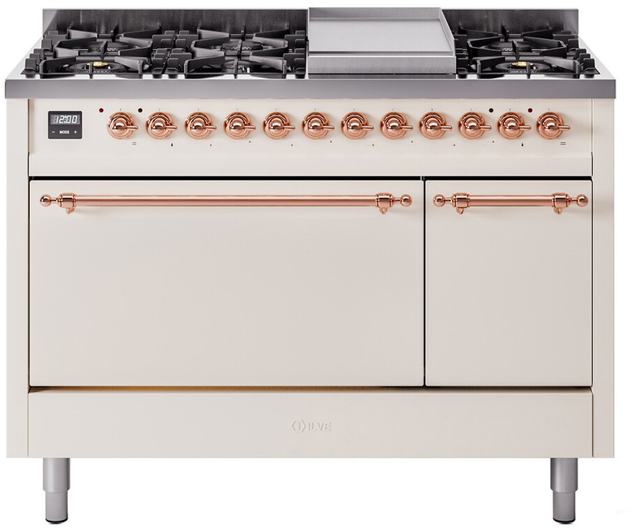 Freestanding Dual Fuel Range with 8 Sealed Burners, 5.02 cu. ft. Total Capacity, Storage Drawer, and Griddle: Antique White, Copper Trim. Enjoy maximum versatility and control with eight sealed burners, perfect for everything from delicate simmering to high-heat searing. With a spacious 5.02 cubic feet oven capacity, you can easily accommodate multiple dishes simultaneously, making it ideal for large families and entertaining. Keep your kitchen organized with the convenient storage drawer, providing extra space for cookware and accessories. The included griddle offers a large, flat cooking surface, perfect for pancakes, sandwiches, and more, adding versatility to your cooking options. With power up to 25000 btu as standard. Optimal supply and perfect distribution of the heat, for all types of cooking. With non-stick nanotechnological treatment. The noble technical characteristics of brass are enriched with a nanotechnological coating that assures easy cleaning, with an elegant Total Black finish. Structure in AISI 304 steel with 12/10 thickness, option to choose the ideal combination between a gas hob with up to 9 burners or induction, mixed and in various setups. The indestructible cast iron pan supports provide a functional and safe support for the pots. The electronic control ensures that the temperature of the oven remains constant throughout, without fluctuating, as is the case in conventional ovens. It can be set with precision starting from 85F, for perfect proofing, up to 575F, for roasting. The door hinges are fitted with a shock absorber that makes the closure more gradual and noiseless. The quick oven preheating function allows it to reach the desired temperature in a short time and you can then choose the best-suited cooking mode for the dish. It also works as rapid defrosting when a low temperature is set (85F - 105F). Pizza function. Quick start. Multiple fan cooking. Intensive cooking. Fan grill cooking. Grill cooking with closed-door. Cooking from above. Cooking from below. Static normal cooking. Grill cooking with closed-door. Cooking from above. Cooking from below. Static normal cooking. Series: Nostalgie II. Fuel Type: Dual Fuel. Gas Type: Natural Gas. Installation Type: Freestanding. Oven Total Capacity (cu. ft.): 5.02. Sabbath Mode: No. Number of Racks: 2. Drawer Type: Storage Drawer. Display Type: LCD Display. Timer: Yes. Cooking Probe: Yes. Rotisserie: Yes. Soft Close Door: Yes. Cooktop Configuration: 8 Sealed Burners + Griddle. Burner/Element Type: Sealed Burner. Griddle: Yes. Grill: No. Oven Control Type: Knobs. Oven Door Type: Solid Door. Number of Ovens: Double Oven. Main Oven Capacity (cu. ft.): 3.5. Second Oven Capacity (cu. ft.): 1.52. Oven Cleaning Type: Easy Clean Enamel Cavities. Main Oven Type: UOV 80 M. Second Oven Type: UOV 30 E. Voltage: 240 V. Amps: 25.8 A. ADA Compliant: No. Star-K Certified: No. Width: 47 7/8". Depth: 25". Height: 38 1/2". Exterior Width: 48".