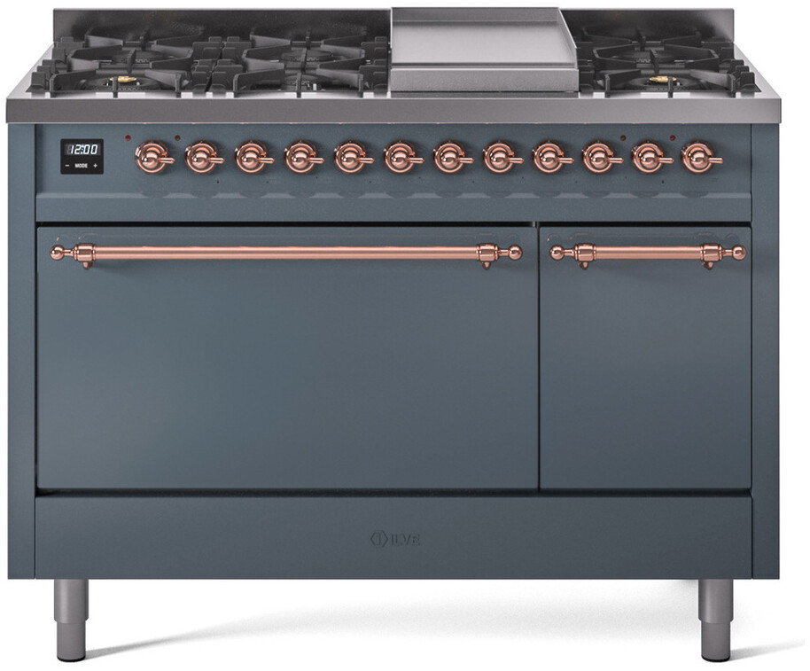 Freestanding Dual Fuel Range with 8 Sealed Burners, 5.02 cu. ft. Total Capacity, Storage Drawer, and Griddle: Blue Grey, Copper Trim. Enjoy maximum versatility and control with eight sealed burners, perfect for everything from delicate simmering to high-heat searing. With a spacious 5.02 cubic feet oven capacity, you can easily accommodate multiple dishes simultaneously, making it ideal for large families and entertaining. Keep your kitchen organized with the convenient storage drawer, providing extra space for cookware and accessories. The included griddle offers a large, flat cooking surface, perfect for pancakes, sandwiches, and more, adding versatility to your cooking options. With power up to 25000 btu as standard. Optimal supply and perfect distribution of the heat, for all types of cooking. With non-stick nanotechnological treatment. The noble technical characteristics of brass are enriched with a nanotechnological coating that assures easy cleaning, with an elegant Total Black finish. Structure in AISI 304 steel with 12/10 thickness, option to choose the ideal combination between a gas hob with up to 9 burners or induction, mixed and in various setups. The indestructible cast iron pan supports provide a functional and safe support for the pots. The electronic control ensures that the temperature of the oven remains constant throughout, without fluctuating, as is the case in conventional ovens. It can be set with precision starting from 85F, for perfect proofing, up to 575F, for roasting. The door hinges are fitted with a shock absorber that makes the closure more gradual and noiseless. The quick oven preheating function allows it to reach the desired temperature in a short time and you can then choose the best-suited cooking mode for the dish. It also works as rapid defrosting when a low temperature is set (85F - 105F). Pizza function. Quick start. Multiple fan cooking. Intensive cooking. Fan grill cooking. Grill cooking with closed-door. Cooking from above. Cooking from below. Static normal cooking. Grill cooking with closed-door. Cooking from above. Cooking from below. Static normal cooking. Series: Nostalgie II. Fuel Type: Dual Fuel. Gas Type: Natural Gas. Installation Type: Freestanding. Oven Total Capacity (cu. ft.): 5.02. Sabbath Mode: No. Number of Racks: 2. Drawer Type: Storage Drawer. Display Type: LCD Display. Timer: Yes. Cooking Probe: Yes. Rotisserie: Yes. Soft Close Door: Yes. Cooktop Configuration: 8 Sealed Burners + Griddle. Burner/Element Type: Sealed Burner. Griddle: Yes. Grill: No. Oven Control Type: Knobs. Oven Door Type: Solid Door. Number of Ovens: Double Oven. Main Oven Capacity (cu. ft.): 3.5. Second Oven Capacity (cu. ft.): 1.52. Oven Cleaning Type: Easy Clean Enamel Cavities. Main Oven Type: UOV 80 M. Second Oven Type: UOV 30 E. Voltage: 240 V. Amps: 25.8 A. ADA Compliant: No. Star-K Certified: No. Width: 47 7/8". Depth: 25". Height: 38 1/2". Exterior Width: 48".