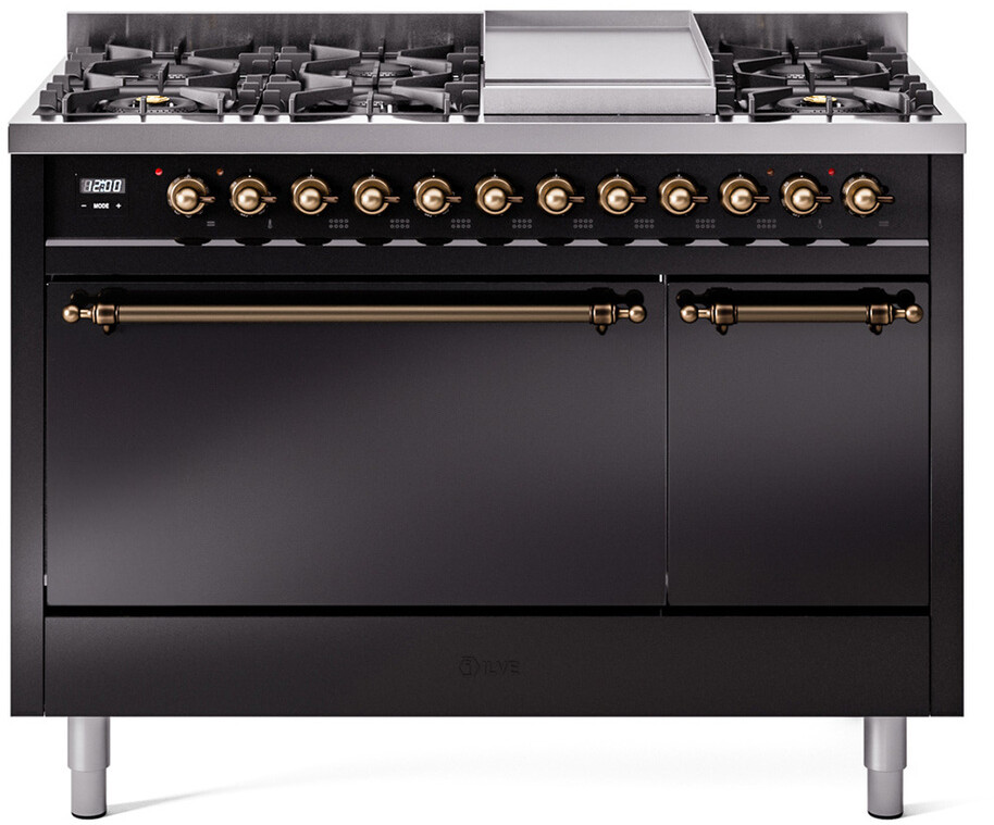 Freestanding Dual Fuel Range with 8 Sealed Burners, 5.02 cu. ft. Total Capacity, Storage Drawer, and Griddle: Glossy Black, Bronze Trim. Enjoy maximum versatility and control with eight sealed burners, perfect for everything from delicate simmering to high-heat searing. With a spacious 5.02 cubic feet oven capacity, you can easily accommodate multiple dishes simultaneously, making it ideal for large families and entertaining. Keep your kitchen organized with the convenient storage drawer, providing extra space for cookware and accessories. The included griddle offers a large, flat cooking surface, perfect for pancakes, sandwiches, and more, adding versatility to your cooking options. With power up to 25000 btu as standard. Optimal supply and perfect distribution of the heat, for all types of cooking. With non-stick nanotechnological treatment. The noble technical characteristics of brass are enriched with a nanotechnological coating that assures easy cleaning, with an elegant Total Black finish. Structure in AISI 304 steel with 12/10 thickness, option to choose the ideal combination between a gas hob with up to 9 burners or induction, mixed and in various setups. The indestructible cast iron pan supports provide a functional and safe support for the pots. The electronic control ensures that the temperature of the oven remains constant throughout, without fluctuating, as is the case in conventional ovens. It can be set with precision starting from 85F, for perfect proofing, up to 575F, for roasting. The door hinges are fitted with a shock absorber that makes the closure more gradual and noiseless. The quick oven preheating function allows it to reach the desired temperature in a short time and you can then choose the best-suited cooking mode for the dish. It also works as rapid defrosting when a low temperature is set (85F - 105F). Pizza function. Quick start. Multiple fan cooking. Intensive cooking. Fan grill cooking. Grill cooking with closed-door. Cooking from above. Cooking from below. Static normal cooking. Grill cooking with closed-door. Cooking from above. Cooking from below. Static normal cooking. Series: Nostalgie II. Fuel Type: Dual Fuel. Gas Type: Natural Gas. Installation Type: Freestanding. Oven Total Capacity (cu. ft.): 5.02. Sabbath Mode: No. Number of Racks: 2. Drawer Type: Storage Drawer. Display Type: LCD Display. Timer: Yes. Cooking Probe: Yes. Rotisserie: Yes. Soft Close Door: Yes. Cooktop Configuration: 8 Sealed Burners + Griddle. Burner/Element Type: Sealed Burner. Griddle: Yes. Grill: No. Oven Control Type: Knobs. Oven Door Type: Solid Door. Number of Ovens: Double Oven. Main Oven Capacity (cu. ft.): 3.5. Second Oven Capacity (cu. ft.): 1.52. Oven Cleaning Type: Easy Clean Enamel Cavities. Main Oven Type: UOV 80 M. Second Oven Type: UOV 30 E. Voltage: 240 V. Amps: 25.8 A. ADA Compliant: No. Star-K Certified: No. Width: 47 7/8". Depth: 25". Height: 38 1/2". Exterior Width: 48".
