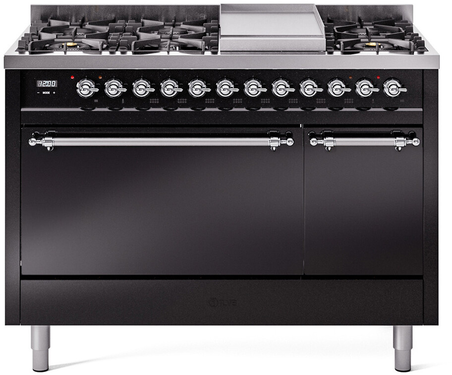 Freestanding Dual Fuel Range with 8 Sealed Burners, 5.02 cu. ft. Total Capacity, Storage Drawer, and Griddle: Glossy Black, Chrome Trim. Enjoy maximum versatility and control with eight sealed burners, perfect for everything from delicate simmering to high-heat searing. With a spacious 5.02 cubic feet oven capacity, you can easily accommodate multiple dishes simultaneously, making it ideal for large families and entertaining. Keep your kitchen organized with the convenient storage drawer, providing extra space for cookware and accessories. The included griddle offers a large, flat cooking surface, perfect for pancakes, sandwiches, and more, adding versatility to your cooking options. With power up to 25000 btu as standard. Optimal supply and perfect distribution of the heat, for all types of cooking. With non-stick nanotechnological treatment. The noble technical characteristics of brass are enriched with a nanotechnological coating that assures easy cleaning, with an elegant Total Black finish. Structure in AISI 304 steel with 12/10 thickness, option to choose the ideal combination between a gas hob with up to 9 burners or induction, mixed and in various setups. The indestructible cast iron pan supports provide a functional and safe support for the pots. The electronic control ensures that the temperature of the oven remains constant throughout, without fluctuating, as is the case in conventional ovens. It can be set with precision starting from 85F, for perfect proofing, up to 575F, for roasting. The door hinges are fitted with a shock absorber that makes the closure more gradual and noiseless. The quick oven preheating function allows it to reach the desired temperature in a short time and you can then choose the best-suited cooking mode for the dish. It also works as rapid defrosting when a low temperature is set (85F - 105F). Pizza function. Quick start. Multiple fan cooking. Intensive cooking. Fan grill cooking. Grill cooking with closed-door. Cooking from above. Cooking from below. Static normal cooking. Grill cooking with closed-door. Cooking from above. Cooking from below. Static normal cooking. Series: Nostalgie II. Fuel Type: Dual Fuel. Gas Type: Natural Gas. Installation Type: Freestanding. Oven Total Capacity (cu. ft.): 5.02. Sabbath Mode: No. Number of Racks: 2. Drawer Type: Storage Drawer. Display Type: LCD Display. Timer: Yes. Cooking Probe: Yes. Rotisserie: Yes. Soft Close Door: Yes. Cooktop Configuration: 8 Sealed Burners + Griddle. Burner/Element Type: Sealed Burner. Griddle: Yes. Grill: No. Oven Control Type: Knobs. Oven Door Type: Solid Door. Number of Ovens: Double Oven. Main Oven Capacity (cu. ft.): 3.5. Second Oven Capacity (cu. ft.): 1.52. Oven Cleaning Type: Easy Clean Enamel Cavities. Main Oven Type: UOV 80 M. Second Oven Type: UOV 30 E. Voltage: 240 V. Amps: 25.8 A. ADA Compliant: No. Star-K Certified: No. Width: 47 7/8". Depth: 25". Height: 38 1/2". Exterior Width: 48".