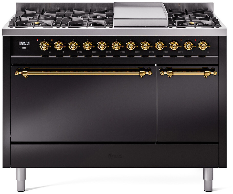 Freestanding Dual Fuel Range with 8 Sealed Burners, 5.02 cu. ft. Total Capacity, Storage Drawer, and Griddle: Glossy Black, Brass Trim. Enjoy maximum versatility and control with eight sealed burners, perfect for everything from delicate simmering to high-heat searing. With a spacious 5.02 cubic feet oven capacity, you can easily accommodate multiple dishes simultaneously, making it ideal for large families and entertaining. Keep your kitchen organized with the convenient storage drawer, providing extra space for cookware and accessories. The included griddle offers a large, flat cooking surface, perfect for pancakes, sandwiches, and more, adding versatility to your cooking options. With power up to 25000 btu as standard. Optimal supply and perfect distribution of the heat, for all types of cooking. With non-stick nanotechnological treatment. The noble technical characteristics of brass are enriched with a nanotechnological coating that assures easy cleaning, with an elegant Total Black finish. Structure in AISI 304 steel with 12/10 thickness, option to choose the ideal combination between a gas hob with up to 9 burners or induction, mixed and in various setups. The indestructible cast iron pan supports provide a functional and safe support for the pots. The electronic control ensures that the temperature of the oven remains constant throughout, without fluctuating, as is the case in conventional ovens. It can be set with precision starting from 85F, for perfect proofing, up to 575F, for roasting. The door hinges are fitted with a shock absorber that makes the closure more gradual and noiseless. The quick oven preheating function allows it to reach the desired temperature in a short time and you can then choose the best-suited cooking mode for the dish. It also works as rapid defrosting when a low temperature is set (85F - 105F). Pizza function. Quick start. Multiple fan cooking. Intensive cooking. Fan grill cooking. Grill cooking with closed-door. Cooking from above. Cooking from below. Static normal cooking. Grill cooking with closed-door. Cooking from above. Cooking from below. Static normal cooking. Series: Nostalgie II. Fuel Type: Dual Fuel. Gas Type: Natural Gas. Installation Type: Freestanding. Oven Total Capacity (cu. ft.): 5.02. Sabbath Mode: No. Number of Racks: 2. Drawer Type: Storage Drawer. Display Type: LCD Display. Timer: Yes. Cooking Probe: Yes. Rotisserie: Yes. Soft Close Door: Yes. Cooktop Configuration: 8 Sealed Burners + Griddle. Burner/Element Type: Sealed Burner. Griddle: Yes. Grill: No. Oven Control Type: Knobs. Oven Door Type: Solid Door. Number of Ovens: Double Oven. Main Oven Capacity (cu. ft.): 3.5. Second Oven Capacity (cu. ft.): 1.52. Oven Cleaning Type: Easy Clean Enamel Cavities. Main Oven Type: UOV 80 M. Second Oven Type: UOV 30 E. Voltage: 240 V. Amps: 25.8 A. ADA Compliant: No. Star-K Certified: No. Width: 47 7/8". Depth: 25". Height: 38 1/2". Exterior Width: 48".