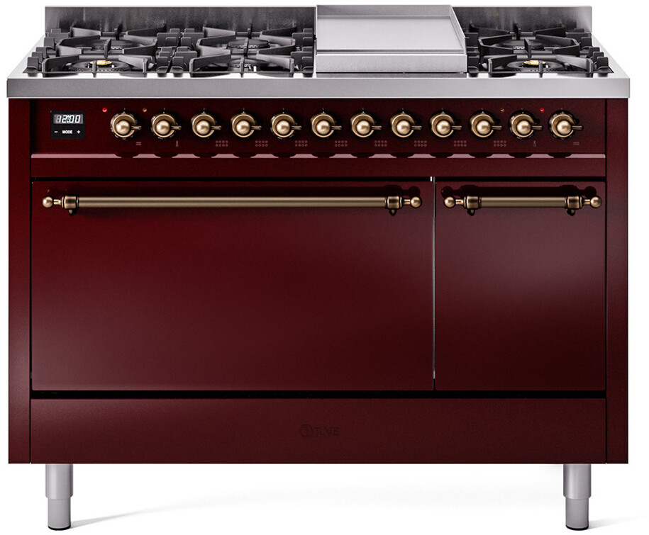 Freestanding Dual Fuel Range with 8 Sealed Burners, 5.02 cu. ft. Total Capacity, Storage Drawer, and Griddle: Burgundy, Bronze Trim. Enjoy maximum versatility and control with eight sealed burners, perfect for everything from delicate simmering to high-heat searing. With a spacious 5.02 cubic feet oven capacity, you can easily accommodate multiple dishes simultaneously, making it ideal for large families and entertaining. Keep your kitchen organized with the convenient storage drawer, providing extra space for cookware and accessories. The included griddle offers a large, flat cooking surface, perfect for pancakes, sandwiches, and more, adding versatility to your cooking options. With power up to 25000 btu as standard. Optimal supply and perfect distribution of the heat, for all types of cooking. With non-stick nanotechnological treatment. The noble technical characteristics of brass are enriched with a nanotechnological coating that assures easy cleaning, with an elegant Total Black finish. Structure in AISI 304 steel with 12/10 thickness, option to choose the ideal combination between a gas hob with up to 9 burners or induction, mixed and in various setups. The indestructible cast iron pan supports provide a functional and safe support for the pots. The electronic control ensures that the temperature of the oven remains constant throughout, without fluctuating, as is the case in conventional ovens. It can be set with precision starting from 85F, for perfect proofing, up to 575F, for roasting. The door hinges are fitted with a shock absorber that makes the closure more gradual and noiseless. The quick oven preheating function allows it to reach the desired temperature in a short time and you can then choose the best-suited cooking mode for the dish. It also works as rapid defrosting when a low temperature is set (85F - 105F). Pizza function. Quick start. Multiple fan cooking. Intensive cooking. Fan grill cooking. Grill cooking with closed-door. Cooking from above. Cooking from below. Static normal cooking. Grill cooking with closed-door. Cooking from above. Cooking from below. Static normal cooking. Series: Nostalgie II. Fuel Type: Dual Fuel. Gas Type: Natural Gas. Installation Type: Freestanding. Oven Total Capacity (cu. ft.): 5.02. Sabbath Mode: No. Number of Racks: 2. Drawer Type: Storage Drawer. Display Type: LCD Display. Timer: Yes. Cooking Probe: Yes. Rotisserie: Yes. Soft Close Door: Yes. Cooktop Configuration: 8 Sealed Burners + Griddle. Burner/Element Type: Sealed Burner. Griddle: Yes. Grill: No. Oven Control Type: Knobs. Oven Door Type: Solid Door. Number of Ovens: Double Oven. Main Oven Capacity (cu. ft.): 3.5. Second Oven Capacity (cu. ft.): 1.52. Oven Cleaning Type: Easy Clean Enamel Cavities. Main Oven Type: UOV 80 M. Second Oven Type: UOV 30 E. Voltage: 240 V. Amps: 25.8 A. ADA Compliant: No. Star-K Certified: No. Width: 47 7/8". Depth: 25". Height: 38 1/2". Exterior Width: 48".