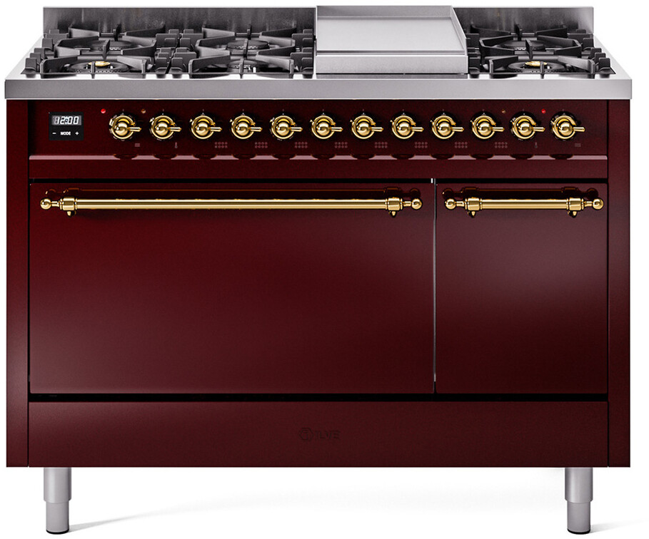 Freestanding Dual Fuel Range with 8 Sealed Burners, 5.02 cu. ft. Total Capacity, Storage Drawer, and Griddle: Burgundy, Brass Trim. Enjoy maximum versatility and control with eight sealed burners, perfect for everything from delicate simmering to high-heat searing. With a spacious 5.02 cubic feet oven capacity, you can easily accommodate multiple dishes simultaneously, making it ideal for large families and entertaining. Keep your kitchen organized with the convenient storage drawer, providing extra space for cookware and accessories. The included griddle offers a large, flat cooking surface, perfect for pancakes, sandwiches, and more, adding versatility to your cooking options. With power up to 25000 btu as standard. Optimal supply and perfect distribution of the heat, for all types of cooking. With non-stick nanotechnological treatment. The noble technical characteristics of brass are enriched with a nanotechnological coating that assures easy cleaning, with an elegant Total Black finish. Structure in AISI 304 steel with 12/10 thickness, option to choose the ideal combination between a gas hob with up to 9 burners or induction, mixed and in various setups. The indestructible cast iron pan supports provide a functional and safe support for the pots. The electronic control ensures that the temperature of the oven remains constant throughout, without fluctuating, as is the case in conventional ovens. It can be set with precision starting from 85F, for perfect proofing, up to 575F, for roasting. The door hinges are fitted with a shock absorber that makes the closure more gradual and noiseless. The quick oven preheating function allows it to reach the desired temperature in a short time and you can then choose the best-suited cooking mode for the dish. It also works as rapid defrosting when a low temperature is set (85F - 105F). Pizza function. Quick start. Multiple fan cooking. Intensive cooking. Fan grill cooking. Grill cooking with closed-door. Cooking from above. Cooking from below. Static normal cooking. Grill cooking with closed-door. Cooking from above. Cooking from below. Static normal cooking. Series: Nostalgie II. Fuel Type: Dual Fuel. Gas Type: Natural Gas. Installation Type: Freestanding. Oven Total Capacity (cu. ft.): 5.02. Sabbath Mode: No. Number of Racks: 2. Drawer Type: Storage Drawer. Display Type: LCD Display. Timer: Yes. Cooking Probe: Yes. Rotisserie: Yes. Soft Close Door: Yes. Cooktop Configuration: 8 Sealed Burners + Griddle. Burner/Element Type: Sealed Burner. Griddle: Yes. Grill: No. Oven Control Type: Knobs. Oven Door Type: Solid Door. Number of Ovens: Double Oven. Main Oven Capacity (cu. ft.): 3.5. Second Oven Capacity (cu. ft.): 1.52. Oven Cleaning Type: Easy Clean Enamel Cavities. Main Oven Type: UOV 80 M. Second Oven Type: UOV 30 E. Voltage: 240 V. Amps: 25.8 A. ADA Compliant: No. Star-K Certified: No. Width: 47 7/8". Depth: 25". Height: 38 1/2". Exterior Width: 48".