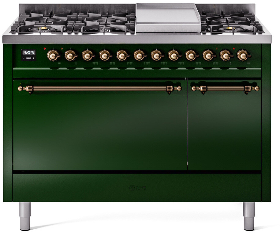 Freestanding Dual Fuel Range with 8 Sealed Burners, 5.02 cu. ft. Total Capacity, Storage Drawer, and Griddle: Emerald Green, Bronze Trim. Enjoy maximum versatility and control with eight sealed burners, perfect for everything from delicate simmering to high-heat searing. With a spacious 5.02 cubic feet oven capacity, you can easily accommodate multiple dishes simultaneously, making it ideal for large families and entertaining. Keep your kitchen organized with the convenient storage drawer, providing extra space for cookware and accessories. The included griddle offers a large, flat cooking surface, perfect for pancakes, sandwiches, and more, adding versatility to your cooking options. With power up to 25000 btu as standard. Optimal supply and perfect distribution of the heat, for all types of cooking. With non-stick nanotechnological treatment. The noble technical characteristics of brass are enriched with a nanotechnological coating that assures easy cleaning, with an elegant Total Black finish. Structure in AISI 304 steel with 12/10 thickness, option to choose the ideal combination between a gas hob with up to 9 burners or induction, mixed and in various setups. The indestructible cast iron pan supports provide a functional and safe support for the pots. The electronic control ensures that the temperature of the oven remains constant throughout, without fluctuating, as is the case in conventional ovens. It can be set with precision starting from 85F, for perfect proofing, up to 575F, for roasting. The door hinges are fitted with a shock absorber that makes the closure more gradual and noiseless. The quick oven preheating function allows it to reach the desired temperature in a short time and you can then choose the best-suited cooking mode for the dish. It also works as rapid defrosting when a low temperature is set (85F - 105F). Pizza function. Quick start. Multiple fan cooking. Intensive cooking. Fan grill cooking. Grill cooking with closed-door. Cooking from above. Cooking from below. Static normal cooking. Grill cooking with closed-door. Cooking from above. Cooking from below. Static normal cooking. Series: Nostalgie II. Fuel Type: Dual Fuel. Gas Type: Natural Gas. Installation Type: Freestanding. Oven Total Capacity (cu. ft.): 5.02. Sabbath Mode: No. Number of Racks: 2. Drawer Type: Storage Drawer. Display Type: LCD Display. Timer: Yes. Cooking Probe: Yes. Rotisserie: Yes. Soft Close Door: Yes. Cooktop Configuration: 8 Sealed Burners + Griddle. Burner/Element Type: Sealed Burner. Griddle: Yes. Grill: No. Oven Control Type: Knobs. Oven Door Type: Solid Door. Number of Ovens: Double Oven. Main Oven Capacity (cu. ft.): 3.5. Second Oven Capacity (cu. ft.): 1.52. Oven Cleaning Type: Easy Clean Enamel Cavities. Main Oven Type: UOV 80 M. Second Oven Type: UOV 30 E. Voltage: 240 V. Amps: 25.8 A. ADA Compliant: No. Star-K Certified: No. Width: 47 7/8". Depth: 25". Height: 38 1/2". Exterior Width: 48".