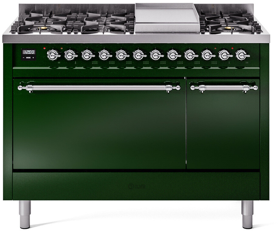 Freestanding Dual Fuel Range with 8 Sealed Burners, 5.02 cu. ft. Total Capacity, Storage Drawer, and Griddle: Emerald Green, Chrome Trim. Enjoy maximum versatility and control with eight sealed burners, perfect for everything from delicate simmering to high-heat searing. With a spacious 5.02 cubic feet oven capacity, you can easily accommodate multiple dishes simultaneously, making it ideal for large families and entertaining. Keep your kitchen organized with the convenient storage drawer, providing extra space for cookware and accessories. The included griddle offers a large, flat cooking surface, perfect for pancakes, sandwiches, and more, adding versatility to your cooking options. With power up to 25000 btu as standard. Optimal supply and perfect distribution of the heat, for all types of cooking. With non-stick nanotechnological treatment. The noble technical characteristics of brass are enriched with a nanotechnological coating that assures easy cleaning, with an elegant Total Black finish. Structure in AISI 304 steel with 12/10 thickness, option to choose the ideal combination between a gas hob with up to 9 burners or induction, mixed and in various setups. The indestructible cast iron pan supports provide a functional and safe support for the pots. The electronic control ensures that the temperature of the oven remains constant throughout, without fluctuating, as is the case in conventional ovens. It can be set with precision starting from 85F, for perfect proofing, up to 575F, for roasting. The door hinges are fitted with a shock absorber that makes the closure more gradual and noiseless. The quick oven preheating function allows it to reach the desired temperature in a short time and you can then choose the best-suited cooking mode for the dish. It also works as rapid defrosting when a low temperature is set (85F - 105F). Pizza function. Quick start. Multiple fan cooking. Intensive cooking. Fan grill cooking. Grill cooking with closed-door. Cooking from above. Cooking from below. Static normal cooking. Grill cooking with closed-door. Cooking from above. Cooking from below. Static normal cooking. Series: Nostalgie II. Fuel Type: Dual Fuel. Gas Type: Natural Gas. Installation Type: Freestanding. Oven Total Capacity (cu. ft.): 5.02. Sabbath Mode: No. Number of Racks: 2. Drawer Type: Storage Drawer. Display Type: LCD Display. Timer: Yes. Cooking Probe: Yes. Rotisserie: Yes. Soft Close Door: Yes. Cooktop Configuration: 8 Sealed Burners + Griddle. Burner/Element Type: Sealed Burner. Griddle: Yes. Grill: No. Oven Control Type: Knobs. Oven Door Type: Solid Door. Number of Ovens: Double Oven. Main Oven Capacity (cu. ft.): 3.5. Second Oven Capacity (cu. ft.): 1.52. Oven Cleaning Type: Easy Clean Enamel Cavities. Main Oven Type: UOV 80 M. Second Oven Type: UOV 30 E. Voltage: 240 V. Amps: 25.8 A. ADA Compliant: No. Star-K Certified: No. Width: 47 7/8". Depth: 25". Height: 38 1/2". Exterior Width: 48".