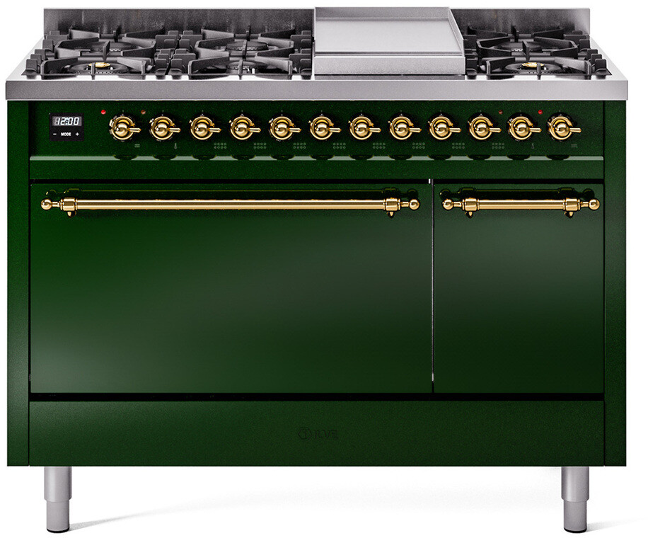 Freestanding Dual Fuel Range with 8 Sealed Burners, 5.02 cu. ft. Total Capacity, Storage Drawer, and Griddle: Emerald Green, Brass Trim. Enjoy maximum versatility and control with eight sealed burners, perfect for everything from delicate simmering to high-heat searing. With a spacious 5.02 cubic feet oven capacity, you can easily accommodate multiple dishes simultaneously, making it ideal for large families and entertaining. Keep your kitchen organized with the convenient storage drawer, providing extra space for cookware and accessories. The included griddle offers a large, flat cooking surface, perfect for pancakes, sandwiches, and more, adding versatility to your cooking options. With power up to 25000 btu as standard. Optimal supply and perfect distribution of the heat, for all types of cooking. With non-stick nanotechnological treatment. The noble technical characteristics of brass are enriched with a nanotechnological coating that assures easy cleaning, with an elegant Total Black finish. Structure in AISI 304 steel with 12/10 thickness, option to choose the ideal combination between a gas hob with up to 9 burners or induction, mixed and in various setups. The indestructible cast iron pan supports provide a functional and safe support for the pots. The electronic control ensures that the temperature of the oven remains constant throughout, without fluctuating, as is the case in conventional ovens. It can be set with precision starting from 85F, for perfect proofing, up to 575F, for roasting. The door hinges are fitted with a shock absorber that makes the closure more gradual and noiseless. The quick oven preheating function allows it to reach the desired temperature in a short time and you can then choose the best-suited cooking mode for the dish. It also works as rapid defrosting when a low temperature is set (85F - 105F). Pizza function. Quick start. Multiple fan cooking. Intensive cooking. Fan grill cooking. Grill cooking with closed-door. Cooking from above. Cooking from below. Static normal cooking. Grill cooking with closed-door. Cooking from above. Cooking from below. Static normal cooking. Series: Nostalgie II. Fuel Type: Dual Fuel. Gas Type: Natural Gas. Installation Type: Freestanding. Oven Total Capacity (cu. ft.): 5.02. Sabbath Mode: No. Number of Racks: 2. Drawer Type: Storage Drawer. Display Type: LCD Display. Timer: Yes. Cooking Probe: Yes. Rotisserie: Yes. Soft Close Door: Yes. Cooktop Configuration: 8 Sealed Burners + Griddle. Burner/Element Type: Sealed Burner. Griddle: Yes. Grill: No. Oven Control Type: Knobs. Oven Door Type: Solid Door. Number of Ovens: Double Oven. Main Oven Capacity (cu. ft.): 3.5. Second Oven Capacity (cu. ft.): 1.52. Oven Cleaning Type: Easy Clean Enamel Cavities. Main Oven Type: UOV 80 M. Second Oven Type: UOV 30 E. Voltage: 240 V. Amps: 25.8 A. ADA Compliant: No. Star-K Certified: No. Width: 47 7/8". Depth: 25". Height: 38 1/2". Exterior Width: 48".