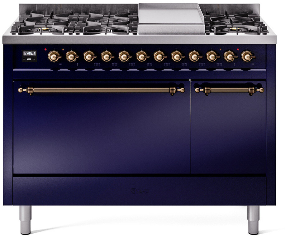 Freestanding Dual Fuel Range with 8 Sealed Burners, 5.02 cu. ft. Total Capacity, Storage Drawer, and Griddle: Midnight Blue, Bronze Trim. Enjoy maximum versatility and control with eight sealed burners, perfect for everything from delicate simmering to high-heat searing. With a spacious 5.02 cubic feet oven capacity, you can easily accommodate multiple dishes simultaneously, making it ideal for large families and entertaining. Keep your kitchen organized with the convenient storage drawer, providing extra space for cookware and accessories. The included griddle offers a large, flat cooking surface, perfect for pancakes, sandwiches, and more, adding versatility to your cooking options. With power up to 25000 btu as standard. Optimal supply and perfect distribution of the heat, for all types of cooking. With non-stick nanotechnological treatment. The noble technical characteristics of brass are enriched with a nanotechnological coating that assures easy cleaning, with an elegant Total Black finish. Structure in AISI 304 steel with 12/10 thickness, option to choose the ideal combination between a gas hob with up to 9 burners or induction, mixed and in various setups. The indestructible cast iron pan supports provide a functional and safe support for the pots. The electronic control ensures that the temperature of the oven remains constant throughout, without fluctuating, as is the case in conventional ovens. It can be set with precision starting from 85F, for perfect proofing, up to 575F, for roasting. The door hinges are fitted with a shock absorber that makes the closure more gradual and noiseless. The quick oven preheating function allows it to reach the desired temperature in a short time and you can then choose the best-suited cooking mode for the dish. It also works as rapid defrosting when a low temperature is set (85F - 105F). Pizza function. Quick start. Multiple fan cooking. Intensive cooking. Fan grill cooking. Grill cooking with closed-door. Cooking from above. Cooking from below. Static normal cooking. Grill cooking with closed-door. Cooking from above. Cooking from below. Static normal cooking. Series: Nostalgie II. Fuel Type: Dual Fuel. Gas Type: Natural Gas. Installation Type: Freestanding. Oven Total Capacity (cu. ft.): 5.02. Sabbath Mode: No. Number of Racks: 2. Drawer Type: Storage Drawer. Display Type: LCD Display. Timer: Yes. Cooking Probe: Yes. Rotisserie: Yes. Soft Close Door: Yes. Cooktop Configuration: 8 Sealed Burners + Griddle. Burner/Element Type: Sealed Burner. Griddle: Yes. Grill: No. Oven Control Type: Knobs. Oven Door Type: Solid Door. Number of Ovens: Double Oven. Main Oven Capacity (cu. ft.): 3.5. Second Oven Capacity (cu. ft.): 1.52. Oven Cleaning Type: Easy Clean Enamel Cavities. Main Oven Type: UOV 80 M. Second Oven Type: UOV 30 E. Voltage: 240 V. Amps: 25.8 A. ADA Compliant: No. Star-K Certified: No. Width: 47 7/8". Depth: 25". Height: 38 1/2". Exterior Width: 48".