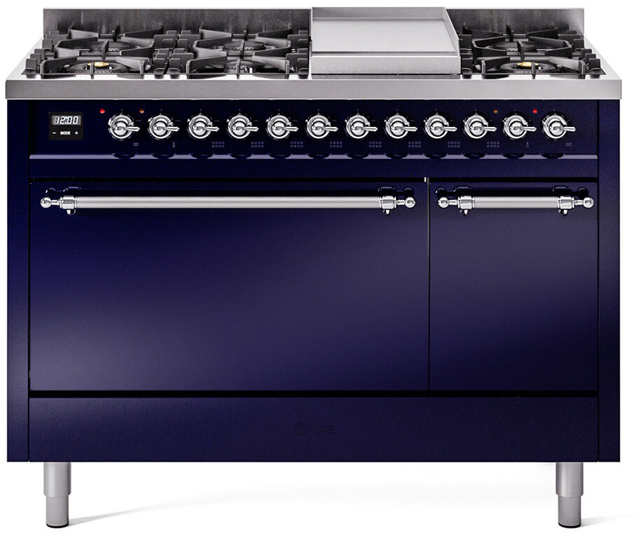 Freestanding Dual Fuel Range with 8 Sealed Burners, 5.02 cu. ft. Total Capacity, Storage Drawer, and Griddle: Midnight Blue, Chrome Trim. Enjoy maximum versatility and control with eight sealed burners, perfect for everything from delicate simmering to high-heat searing. With a spacious 5.02 cubic feet oven capacity, you can easily accommodate multiple dishes simultaneously, making it ideal for large families and entertaining. Keep your kitchen organized with the convenient storage drawer, providing extra space for cookware and accessories. The included griddle offers a large, flat cooking surface, perfect for pancakes, sandwiches, and more, adding versatility to your cooking options. With power up to 25000 btu as standard. Optimal supply and perfect distribution of the heat, for all types of cooking. With non-stick nanotechnological treatment. The noble technical characteristics of brass are enriched with a nanotechnological coating that assures easy cleaning, with an elegant Total Black finish. Structure in AISI 304 steel with 12/10 thickness, option to choose the ideal combination between a gas hob with up to 9 burners or induction, mixed and in various setups. The indestructible cast iron pan supports provide a functional and safe support for the pots. The electronic control ensures that the temperature of the oven remains constant throughout, without fluctuating, as is the case in conventional ovens. It can be set with precision starting from 85F, for perfect proofing, up to 575F, for roasting. The door hinges are fitted with a shock absorber that makes the closure more gradual and noiseless. The quick oven preheating function allows it to reach the desired temperature in a short time and you can then choose the best-suited cooking mode for the dish. It also works as rapid defrosting when a low temperature is set (85F - 105F). Pizza function. Quick start. Multiple fan cooking. Intensive cooking. Fan grill cooking. Grill cooking with closed-door. Cooking from above. Cooking from below. Static normal cooking. Grill cooking with closed-door. Cooking from above. Cooking from below. Static normal cooking. Series: Nostalgie II. Fuel Type: Dual Fuel. Gas Type: Natural Gas. Installation Type: Freestanding. Oven Total Capacity (cu. ft.): 5.02. Sabbath Mode: No. Number of Racks: 2. Drawer Type: Storage Drawer. Display Type: LCD Display. Timer: Yes. Cooking Probe: Yes. Rotisserie: Yes. Soft Close Door: Yes. Cooktop Configuration: 8 Sealed Burners + Griddle. Burner/Element Type: Sealed Burner. Griddle: Yes. Grill: No. Oven Control Type: Knobs. Oven Door Type: Solid Door. Number of Ovens: Double Oven. Main Oven Capacity (cu. ft.): 3.5. Second Oven Capacity (cu. ft.): 1.52. Oven Cleaning Type: Easy Clean Enamel Cavities. Main Oven Type: UOV 80 M. Second Oven Type: UOV 30 E. Voltage: 240 V. Amps: 25.8 A. ADA Compliant: No. Star-K Certified: No. Width: 47 7/8". Depth: 25". Height: 38 1/2". Exterior Width: 48".