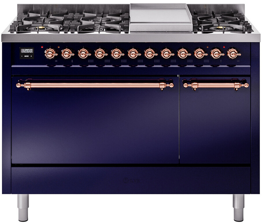 Freestanding Dual Fuel Range with 8 Sealed Burners, 5.02 cu. ft. Total Capacity, Storage Drawer, and Griddle: Midnight Blue, Copper Trim. Enjoy maximum versatility and control with eight sealed burners, perfect for everything from delicate simmering to high-heat searing. With a spacious 5.02 cubic feet oven capacity, you can easily accommodate multiple dishes simultaneously, making it ideal for large families and entertaining. Keep your kitchen organized with the convenient storage drawer, providing extra space for cookware and accessories. The included griddle offers a large, flat cooking surface, perfect for pancakes, sandwiches, and more, adding versatility to your cooking options. With power up to 25000 btu as standard. Optimal supply and perfect distribution of the heat, for all types of cooking. With non-stick nanotechnological treatment. The noble technical characteristics of brass are enriched with a nanotechnological coating that assures easy cleaning, with an elegant Total Black finish. Structure in AISI 304 steel with 12/10 thickness, option to choose the ideal combination between a gas hob with up to 9 burners or induction, mixed and in various setups. The indestructible cast iron pan supports provide a functional and safe support for the pots. The electronic control ensures that the temperature of the oven remains constant throughout, without fluctuating, as is the case in conventional ovens. It can be set with precision starting from 85F, for perfect proofing, up to 575F, for roasting. The door hinges are fitted with a shock absorber that makes the closure more gradual and noiseless. The quick oven preheating function allows it to reach the desired temperature in a short time and you can then choose the best-suited cooking mode for the dish. It also works as rapid defrosting when a low temperature is set (85F - 105F). Pizza function. Quick start. Multiple fan cooking. Intensive cooking. Fan grill cooking. Grill cooking with closed-door. Cooking from above. Cooking from below. Static normal cooking. Grill cooking with closed-door. Cooking from above. Cooking from below. Static normal cooking. Series: Nostalgie II. Fuel Type: Dual Fuel. Gas Type: Natural Gas. Installation Type: Freestanding. Oven Total Capacity (cu. ft.): 5.02. Sabbath Mode: No. Number of Racks: 2. Drawer Type: Storage Drawer. Display Type: LCD Display. Timer: Yes. Cooking Probe: Yes. Rotisserie: Yes. Soft Close Door: Yes. Cooktop Configuration: 8 Sealed Burners + Griddle. Burner/Element Type: Sealed Burner. Griddle: Yes. Grill: No. Oven Control Type: Knobs. Oven Door Type: Solid Door. Number of Ovens: Double Oven. Main Oven Capacity (cu. ft.): 3.5. Second Oven Capacity (cu. ft.): 1.52. Oven Cleaning Type: Easy Clean Enamel Cavities. Main Oven Type: UOV 80 M. Second Oven Type: UOV 30 E. Voltage: 240 V. Amps: 25.8 A. ADA Compliant: No. Star-K Certified: No. Width: 47 7/8". Depth: 25". Height: 38 1/2". Exterior Width: 48".