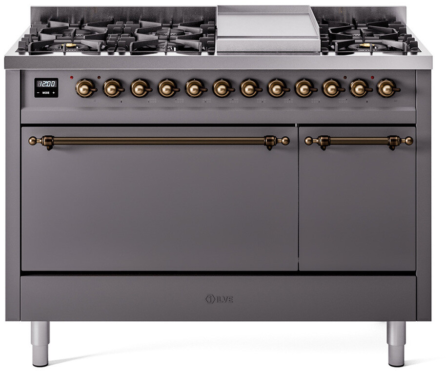 Freestanding Dual Fuel Range with 8 Sealed Burners, 5.02 cu. ft. Total Capacity, Storage Drawer, and Griddle: Graphite Matte, Bronze Trim. Enjoy maximum versatility and control with eight sealed burners, perfect for everything from delicate simmering to high-heat searing. With a spacious 5.02 cubic feet oven capacity, you can easily accommodate multiple dishes simultaneously, making it ideal for large families and entertaining. Keep your kitchen organized with the convenient storage drawer, providing extra space for cookware and accessories. The included griddle offers a large, flat cooking surface, perfect for pancakes, sandwiches, and more, adding versatility to your cooking options. With power up to 25000 btu as standard. Optimal supply and perfect distribution of the heat, for all types of cooking. With non-stick nanotechnological treatment. The noble technical characteristics of brass are enriched with a nanotechnological coating that assures easy cleaning, with an elegant Total Black finish. Structure in AISI 304 steel with 12/10 thickness, option to choose the ideal combination between a gas hob with up to 9 burners or induction, mixed and in various setups. The indestructible cast iron pan supports provide a functional and safe support for the pots. The electronic control ensures that the temperature of the oven remains constant throughout, without fluctuating, as is the case in conventional ovens. It can be set with precision starting from 85F, for perfect proofing, up to 575F, for roasting. The door hinges are fitted with a shock absorber that makes the closure more gradual and noiseless. The quick oven preheating function allows it to reach the desired temperature in a short time and you can then choose the best-suited cooking mode for the dish. It also works as rapid defrosting when a low temperature is set (85F - 105F). Pizza function. Quick start. Multiple fan cooking. Intensive cooking. Fan grill cooking. Grill cooking with closed-door. Cooking from above. Cooking from below. Static normal cooking. Grill cooking with closed-door. Cooking from above. Cooking from below. Static normal cooking. Series: Nostalgie II. Fuel Type: Dual Fuel. Gas Type: Natural Gas. Installation Type: Freestanding. Oven Total Capacity (cu. ft.): 5.02. Sabbath Mode: No. Number of Racks: 2. Drawer Type: Storage Drawer. Display Type: LCD Display. Timer: Yes. Cooking Probe: Yes. Rotisserie: Yes. Soft Close Door: Yes. Cooktop Configuration: 8 Sealed Burners + Griddle. Burner/Element Type: Sealed Burner. Griddle: Yes. Grill: No. Oven Control Type: Knobs. Oven Door Type: Solid Door. Number of Ovens: Double Oven. Main Oven Capacity (cu. ft.): 3.5. Second Oven Capacity (cu. ft.): 1.52. Oven Cleaning Type: Easy Clean Enamel Cavities. Main Oven Type: UOV 80 M. Second Oven Type: UOV 30 E. Voltage: 240 V. Amps: 25.8 A. ADA Compliant: No. Star-K Certified: No. Width: 47 7/8". Depth: 25". Height: 38 1/2". Exterior Width: 48".