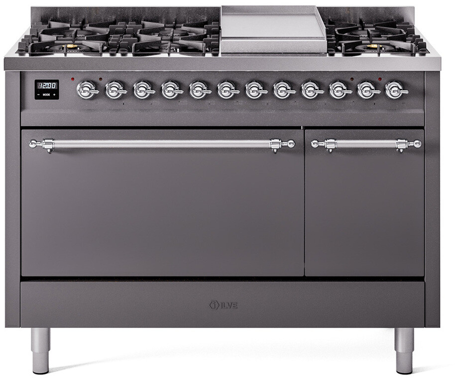 Freestanding Dual Fuel Range with 8 Sealed Burners, 5.02 cu. ft. Total Capacity, Storage Drawer, and Griddle: Graphite Matte, Chrome Trim. Enjoy maximum versatility and control with eight sealed burners, perfect for everything from delicate simmering to high-heat searing. With a spacious 5.02 cubic feet oven capacity, you can easily accommodate multiple dishes simultaneously, making it ideal for large families and entertaining. Keep your kitchen organized with the convenient storage drawer, providing extra space for cookware and accessories. The included griddle offers a large, flat cooking surface, perfect for pancakes, sandwiches, and more, adding versatility to your cooking options. With power up to 25000 btu as standard. Optimal supply and perfect distribution of the heat, for all types of cooking. With non-stick nanotechnological treatment. The noble technical characteristics of brass are enriched with a nanotechnological coating that assures easy cleaning, with an elegant Total Black finish. Structure in AISI 304 steel with 12/10 thickness, option to choose the ideal combination between a gas hob with up to 9 burners or induction, mixed and in various setups. The indestructible cast iron pan supports provide a functional and safe support for the pots. The electronic control ensures that the temperature of the oven remains constant throughout, without fluctuating, as is the case in conventional ovens. It can be set with precision starting from 85F, for perfect proofing, up to 575F, for roasting. The door hinges are fitted with a shock absorber that makes the closure more gradual and noiseless. The quick oven preheating function allows it to reach the desired temperature in a short time and you can then choose the best-suited cooking mode for the dish. It also works as rapid defrosting when a low temperature is set (85F - 105F). Pizza function. Quick start. Multiple fan cooking. Intensive cooking. Fan grill cooking. Grill cooking with closed-door. Cooking from above. Cooking from below. Static normal cooking. Grill cooking with closed-door. Cooking from above. Cooking from below. Static normal cooking. Series: Nostalgie II. Fuel Type: Dual Fuel. Gas Type: Natural Gas. Installation Type: Freestanding. Oven Total Capacity (cu. ft.): 5.02. Sabbath Mode: No. Number of Racks: 2. Drawer Type: Storage Drawer. Display Type: LCD Display. Timer: Yes. Cooking Probe: Yes. Rotisserie: Yes. Soft Close Door: Yes. Cooktop Configuration: 8 Sealed Burners + Griddle. Burner/Element Type: Sealed Burner. Griddle: Yes. Grill: No. Oven Control Type: Knobs. Oven Door Type: Solid Door. Number of Ovens: Double Oven. Main Oven Capacity (cu. ft.): 3.5. Second Oven Capacity (cu. ft.): 1.52. Oven Cleaning Type: Easy Clean Enamel Cavities. Main Oven Type: UOV 80 M. Second Oven Type: UOV 30 E. Voltage: 240 V. Amps: 25.8 A. ADA Compliant: No. Star-K Certified: No. Width: 47 7/8". Depth: 25". Height: 38 1/2". Exterior Width: 48".