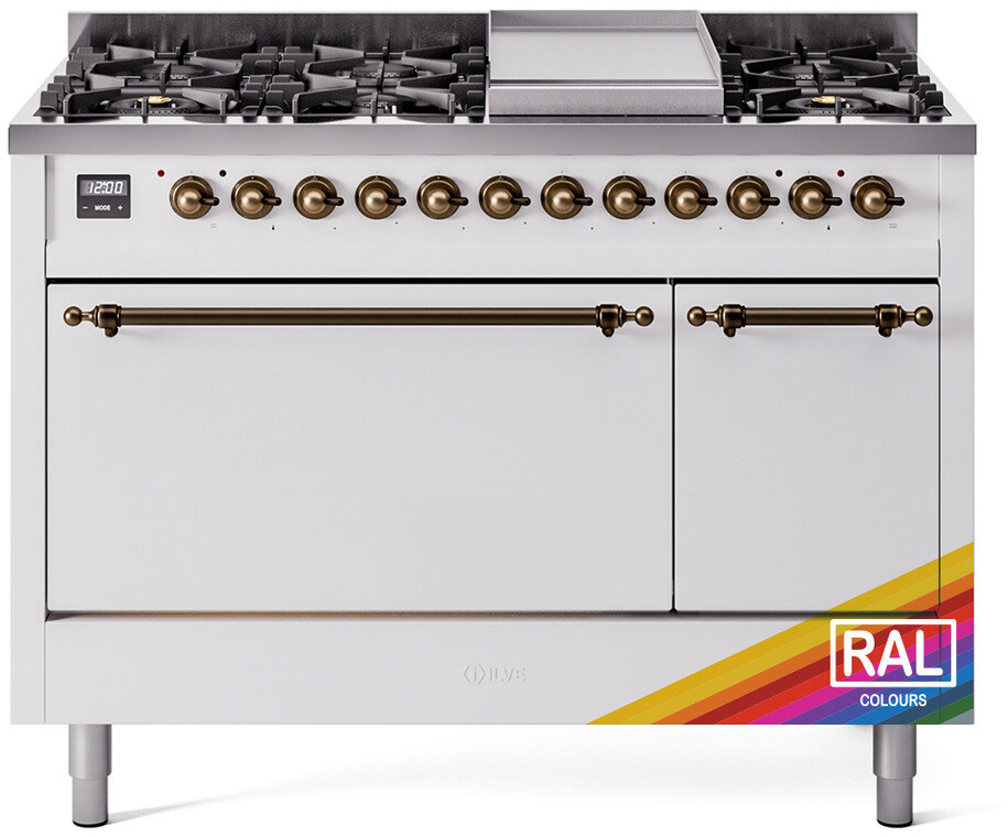 Freestanding Dual Fuel Range with 8 Sealed Burners, 5.02 cu. ft. Total Capacity, Storage Drawer, and Griddle: RAL Color, Bronze Trim. Enjoy maximum versatility and control with eight sealed burners, perfect for everything from delicate simmering to high-heat searing. With a spacious 5.02 cubic feet oven capacity, you can easily accommodate multiple dishes simultaneously, making it ideal for large families and entertaining. Keep your kitchen organized with the convenient storage drawer, providing extra space for cookware and accessories. The included griddle offers a large, flat cooking surface, perfect for pancakes, sandwiches, and more, adding versatility to your cooking options. With power up to 25000 btu as standard. Optimal supply and perfect distribution of the heat, for all types of cooking. With non-stick nanotechnological treatment. The noble technical characteristics of brass are enriched with a nanotechnological coating that assures easy cleaning, with an elegant Total Black finish. Structure in AISI 304 steel with 12/10 thickness, option to choose the ideal combination between a gas hob with up to 9 burners or induction, mixed and in various setups. The indestructible cast iron pan supports provide a functional and safe support for the pots. The electronic control ensures that the temperature of the oven remains constant throughout, without fluctuating, as is the case in conventional ovens. It can be set with precision starting from 85F, for perfect proofing, up to 575F, for roasting. The door hinges are fitted with a shock absorber that makes the closure more gradual and noiseless. The quick oven preheating function allows it to reach the desired temperature in a short time and you can then choose the best-suited cooking mode for the dish. It also works as rapid defrosting when a low temperature is set (85F - 105F). Pizza function. Quick start. Multiple fan cooking. Intensive cooking. Fan grill cooking. Grill cooking with closed-door. Cooking from above. Cooking from below. Static normal cooking. Grill cooking with closed-door. Cooking from above. Cooking from below. Static normal cooking. Series: Nostalgie II. Fuel Type: Dual Fuel. Gas Type: Natural Gas. Installation Type: Freestanding. Oven Total Capacity (cu. ft.): 5.02. Sabbath Mode: No. Number of Racks: 2. Drawer Type: Storage Drawer. Display Type: LCD Display. Timer: Yes. Cooking Probe: Yes. Rotisserie: Yes. Soft Close Door: Yes. Cooktop Configuration: 8 Sealed Burners + Griddle. Burner/Element Type: Sealed Burner. Griddle: Yes. Grill: No. Oven Control Type: Knobs. Oven Door Type: Solid Door. Number of Ovens: Double Oven. Main Oven Capacity (cu. ft.): 3.5. Second Oven Capacity (cu. ft.): 1.52. Oven Cleaning Type: Easy Clean Enamel Cavities. Main Oven Type: UOV 80 M. Second Oven Type: UOV 30 E. Voltage: 240 V. Amps: 25.8 A. ADA Compliant: No. Star-K Certified: No. Width: 47 7/8". Depth: 25". Height: 38 1/2". Exterior Width: 48".