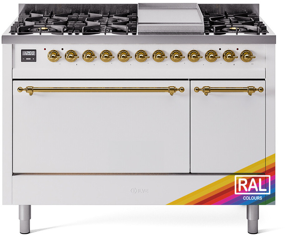 Freestanding Dual Fuel Range with 8 Sealed Burners, 5.02 cu. ft. Total Capacity, Storage Drawer, and Griddle: RAL Color, Brass Trim. Enjoy maximum versatility and control with eight sealed burners, perfect for everything from delicate simmering to high-heat searing. With a spacious 5.02 cubic feet oven capacity, you can easily accommodate multiple dishes simultaneously, making it ideal for large families and entertaining. Keep your kitchen organized with the convenient storage drawer, providing extra space for cookware and accessories. The included griddle offers a large, flat cooking surface, perfect for pancakes, sandwiches, and more, adding versatility to your cooking options. With power up to 25000 btu as standard. Optimal supply and perfect distribution of the heat, for all types of cooking. With non-stick nanotechnological treatment. The noble technical characteristics of brass are enriched with a nanotechnological coating that assures easy cleaning, with an elegant Total Black finish. Structure in AISI 304 steel with 12/10 thickness, option to choose the ideal combination between a gas hob with up to 9 burners or induction, mixed and in various setups. The indestructible cast iron pan supports provide a functional and safe support for the pots. The electronic control ensures that the temperature of the oven remains constant throughout, without fluctuating, as is the case in conventional ovens. It can be set with precision starting from 85F, for perfect proofing, up to 575F, for roasting. The door hinges are fitted with a shock absorber that makes the closure more gradual and noiseless. The quick oven preheating function allows it to reach the desired temperature in a short time and you can then choose the best-suited cooking mode for the dish. It also works as rapid defrosting when a low temperature is set (85F - 105F). Pizza function. Quick start. Multiple fan cooking. Intensive cooking. Fan grill cooking. Grill cooking with closed-door. Cooking from above. Cooking from below. Static normal cooking. Grill cooking with closed-door. Cooking from above. Cooking from below. Static normal cooking. Series: Nostalgie II. Fuel Type: Dual Fuel. Gas Type: Natural Gas. Installation Type: Freestanding. Oven Total Capacity (cu. ft.): 5.02. Sabbath Mode: No. Number of Racks: 2. Drawer Type: Storage Drawer. Display Type: LCD Display. Timer: Yes. Cooking Probe: Yes. Rotisserie: Yes. Soft Close Door: Yes. Cooktop Configuration: 8 Sealed Burners + Griddle. Burner/Element Type: Sealed Burner. Griddle: Yes. Grill: No. Oven Control Type: Knobs. Oven Door Type: Solid Door. Number of Ovens: Double Oven. Main Oven Capacity (cu. ft.): 3.5. Second Oven Capacity (cu. ft.): 1.52. Oven Cleaning Type: Easy Clean Enamel Cavities. Main Oven Type: UOV 80 M. Second Oven Type: UOV 30 E. Voltage: 240 V. Amps: 25.8 A. ADA Compliant: No. Star-K Certified: No. Width: 47 7/8". Depth: 25". Height: 38 1/2". Exterior Width: 48".
