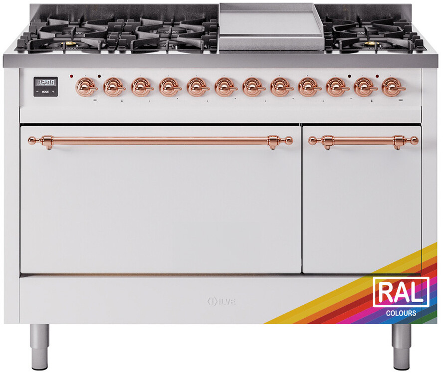 Freestanding Dual Fuel Range with 8 Sealed Burners, 5.02 cu. ft. Total Capacity, Storage Drawer, and Griddle: RAL Color, Copper Trim. Enjoy maximum versatility and control with eight sealed burners, perfect for everything from delicate simmering to high-heat searing. With a spacious 5.02 cubic feet oven capacity, you can easily accommodate multiple dishes simultaneously, making it ideal for large families and entertaining. Keep your kitchen organized with the convenient storage drawer, providing extra space for cookware and accessories. The included griddle offers a large, flat cooking surface, perfect for pancakes, sandwiches, and more, adding versatility to your cooking options. With power up to 25000 btu as standard. Optimal supply and perfect distribution of the heat, for all types of cooking. With non-stick nanotechnological treatment. The noble technical characteristics of brass are enriched with a nanotechnological coating that assures easy cleaning, with an elegant Total Black finish. Structure in AISI 304 steel with 12/10 thickness, option to choose the ideal combination between a gas hob with up to 9 burners or induction, mixed and in various setups. The indestructible cast iron pan supports provide a functional and safe support for the pots. The electronic control ensures that the temperature of the oven remains constant throughout, without fluctuating, as is the case in conventional ovens. It can be set with precision starting from 85F, for perfect proofing, up to 575F, for roasting. The door hinges are fitted with a shock absorber that makes the closure more gradual and noiseless. The quick oven preheating function allows it to reach the desired temperature in a short time and you can then choose the best-suited cooking mode for the dish. It also works as rapid defrosting when a low temperature is set (85F - 105F). Pizza function. Quick start. Multiple fan cooking. Intensive cooking. Fan grill cooking. Grill cooking with closed-door. Cooking from above. Cooking from below. Static normal cooking. Grill cooking with closed-door. Cooking from above. Cooking from below. Static normal cooking. Series: Nostalgie II. Fuel Type: Dual Fuel. Gas Type: Natural Gas. Installation Type: Freestanding. Oven Total Capacity (cu. ft.): 5.02. Sabbath Mode: No. Number of Racks: 2. Drawer Type: Storage Drawer. Display Type: LCD Display. Timer: Yes. Cooking Probe: Yes. Rotisserie: Yes. Soft Close Door: Yes. Cooktop Configuration: 8 Sealed Burners + Griddle. Burner/Element Type: Sealed Burner. Griddle: Yes. Grill: No. Oven Control Type: Knobs. Oven Door Type: Solid Door. Number of Ovens: Double Oven. Main Oven Capacity (cu. ft.): 3.5. Second Oven Capacity (cu. ft.): 1.52. Oven Cleaning Type: Easy Clean Enamel Cavities. Main Oven Type: UOV 80 M. Second Oven Type: UOV 30 E. Voltage: 240 V. Amps: 25.8 A. ADA Compliant: No. Star-K Certified: No. Width: 47 7/8". Depth: 25". Height: 38 1/2". Exterior Width: 48".