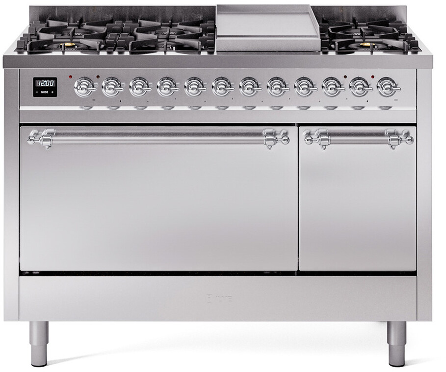Freestanding Dual Fuel Range with 8 Sealed Burners, 5.02 cu. ft. Total Capacity, Storage Drawer, and Griddle: Stainless Steel, Chrome Trim. Enjoy maximum versatility and control with eight sealed burners, perfect for everything from delicate simmering to high-heat searing. With a spacious 5.02 cubic feet oven capacity, you can easily accommodate multiple dishes simultaneously, making it ideal for large families and entertaining. Keep your kitchen organized with the convenient storage drawer, providing extra space for cookware and accessories. The included griddle offers a large, flat cooking surface, perfect for pancakes, sandwiches, and more, adding versatility to your cooking options. With power up to 25000 btu as standard. Optimal supply and perfect distribution of the heat, for all types of cooking. With non-stick nanotechnological treatment. The noble technical characteristics of brass are enriched with a nanotechnological coating that assures easy cleaning, with an elegant Total Black finish. Structure in AISI 304 steel with 12/10 thickness, option to choose the ideal combination between a gas hob with up to 9 burners or induction, mixed and in various setups. The indestructible cast iron pan supports provide a functional and safe support for the pots. The electronic control ensures that the temperature of the oven remains constant throughout, without fluctuating, as is the case in conventional ovens. It can be set with precision starting from 85F, for perfect proofing, up to 575F, for roasting. The door hinges are fitted with a shock absorber that makes the closure more gradual and noiseless. The quick oven preheating function allows it to reach the desired temperature in a short time and you can then choose the best-suited cooking mode for the dish. It also works as rapid defrosting when a low temperature is set (85F - 105F). Pizza function. Quick start. Multiple fan cooking. Intensive cooking. Fan grill cooking. Grill cooking with closed-door. Cooking from above. Cooking from below. Static normal cooking. Grill cooking with closed-door. Cooking from above. Cooking from below. Static normal cooking. Series: Nostalgie II. Fuel Type: Dual Fuel. Gas Type: Natural Gas. Installation Type: Freestanding. Oven Total Capacity (cu. ft.): 5.02. Sabbath Mode: No. Number of Racks: 2. Drawer Type: Storage Drawer. Display Type: LCD Display. Timer: Yes. Cooking Probe: Yes. Rotisserie: Yes. Soft Close Door: Yes. Cooktop Configuration: 8 Sealed Burners + Griddle. Burner/Element Type: Sealed Burner. Griddle: Yes. Grill: No. Oven Control Type: Knobs. Oven Door Type: Solid Door. Number of Ovens: Double Oven. Main Oven Capacity (cu. ft.): 3.5. Second Oven Capacity (cu. ft.): 1.52. Oven Cleaning Type: Easy Clean Enamel Cavities. Main Oven Type: UOV 80 M. Second Oven Type: UOV 30 E. Voltage: 240 V. Amps: 25.8 A. ADA Compliant: No. Star-K Certified: No. Width: 47 7/8". Depth: 25". Height: 38 1/2". Exterior Width: 48".