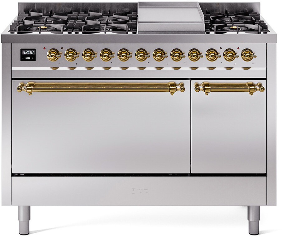 Freestanding Dual Fuel Range with 8 Sealed Burners, 5.02 cu. ft. Total Capacity, Storage Drawer, and Griddle: Stainless Steel, Brass Trim. Enjoy maximum versatility and control with eight sealed burners, perfect for everything from delicate simmering to high-heat searing. With a spacious 5.02 cubic feet oven capacity, you can easily accommodate multiple dishes simultaneously, making it ideal for large families and entertaining. Keep your kitchen organized with the convenient storage drawer, providing extra space for cookware and accessories. The included griddle offers a large, flat cooking surface, perfect for pancakes, sandwiches, and more, adding versatility to your cooking options. With power up to 25000 btu as standard. Optimal supply and perfect distribution of the heat, for all types of cooking. With non-stick nanotechnological treatment. The noble technical characteristics of brass are enriched with a nanotechnological coating that assures easy cleaning, with an elegant Total Black finish. Structure in AISI 304 steel with 12/10 thickness, option to choose the ideal combination between a gas hob with up to 9 burners or induction, mixed and in various setups. The indestructible cast iron pan supports provide a functional and safe support for the pots. The electronic control ensures that the temperature of the oven remains constant throughout, without fluctuating, as is the case in conventional ovens. It can be set with precision starting from 85F, for perfect proofing, up to 575F, for roasting. The door hinges are fitted with a shock absorber that makes the closure more gradual and noiseless. The quick oven preheating function allows it to reach the desired temperature in a short time and you can then choose the best-suited cooking mode for the dish. It also works as rapid defrosting when a low temperature is set (85F - 105F). Pizza function. Quick start. Multiple fan cooking. Intensive cooking. Fan grill cooking. Grill cooking with closed-door. Cooking from above. Cooking from below. Static normal cooking. Grill cooking with closed-door. Cooking from above. Cooking from below. Static normal cooking. Series: Nostalgie II. Fuel Type: Dual Fuel. Gas Type: Natural Gas. Installation Type: Freestanding. Oven Total Capacity (cu. ft.): 5.02. Sabbath Mode: No. Number of Racks: 2. Drawer Type: Storage Drawer. Display Type: LCD Display. Timer: Yes. Cooking Probe: Yes. Rotisserie: Yes. Soft Close Door: Yes. Cooktop Configuration: 8 Sealed Burners + Griddle. Burner/Element Type: Sealed Burner. Griddle: Yes. Grill: No. Oven Control Type: Knobs. Oven Door Type: Solid Door. Number of Ovens: Double Oven. Main Oven Capacity (cu. ft.): 3.5. Second Oven Capacity (cu. ft.): 1.52. Oven Cleaning Type: Easy Clean Enamel Cavities. Main Oven Type: UOV 80 M. Second Oven Type: UOV 30 E. Voltage: 240 V. Amps: 25.8 A. ADA Compliant: No. Star-K Certified: No. Width: 47 7/8". Depth: 25". Height: 38 1/2". Exterior Width: 48".
