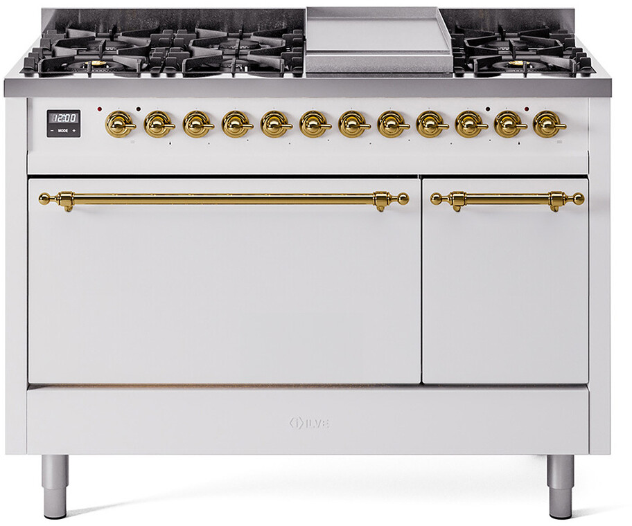 Freestanding Dual Fuel Range with 8 Sealed Burners, 5.02 cu. ft. Total Capacity, Storage Drawer, and Griddle: White, Brass Trim. Enjoy maximum versatility and control with eight sealed burners, perfect for everything from delicate simmering to high-heat searing. With a spacious 5.02 cubic feet oven capacity, you can easily accommodate multiple dishes simultaneously, making it ideal for large families and entertaining. Keep your kitchen organized with the convenient storage drawer, providing extra space for cookware and accessories. The included griddle offers a large, flat cooking surface, perfect for pancakes, sandwiches, and more, adding versatility to your cooking options. With power up to 25000 btu as standard. Optimal supply and perfect distribution of the heat, for all types of cooking. With non-stick nanotechnological treatment. The noble technical characteristics of brass are enriched with a nanotechnological coating that assures easy cleaning, with an elegant Total Black finish. Structure in AISI 304 steel with 12/10 thickness, option to choose the ideal combination between a gas hob with up to 9 burners or induction, mixed and in various setups. The indestructible cast iron pan supports provide a functional and safe support for the pots. The electronic control ensures that the temperature of the oven remains constant throughout, without fluctuating, as is the case in conventional ovens. It can be set with precision starting from 85F, for perfect proofing, up to 575F, for roasting. The door hinges are fitted with a shock absorber that makes the closure more gradual and noiseless. The quick oven preheating function allows it to reach the desired temperature in a short time and you can then choose the best-suited cooking mode for the dish. It also works as rapid defrosting when a low temperature is set (85F - 105F). Pizza function. Quick start. Multiple fan cooking. Intensive cooking. Fan grill cooking. Grill cooking with closed-door. Cooking from above. Cooking from below. Static normal cooking. Grill cooking with closed-door. Cooking from above. Cooking from below. Static normal cooking. Series: Nostalgie II. Fuel Type: Dual Fuel. Gas Type: Natural Gas. Installation Type: Freestanding. Oven Total Capacity (cu. ft.): 5.02. Sabbath Mode: No. Number of Racks: 2. Drawer Type: Storage Drawer. Display Type: LCD Display. Timer: Yes. Cooking Probe: Yes. Rotisserie: Yes. Soft Close Door: Yes. Cooktop Configuration: 8 Sealed Burners + Griddle. Burner/Element Type: Sealed Burner. Griddle: Yes. Grill: No. Oven Control Type: Knobs. Oven Door Type: Solid Door. Number of Ovens: Double Oven. Main Oven Capacity (cu. ft.): 3.5. Second Oven Capacity (cu. ft.): 1.52. Oven Cleaning Type: Easy Clean Enamel Cavities. Main Oven Type: UOV 80 M. Second Oven Type: UOV 30 E. Voltage: 240 V. Amps: 25.8 A. ADA Compliant: No. Star-K Certified: No. Width: 47 7/8". Depth: 25". Height: 38 1/2". Exterior Width: 48".