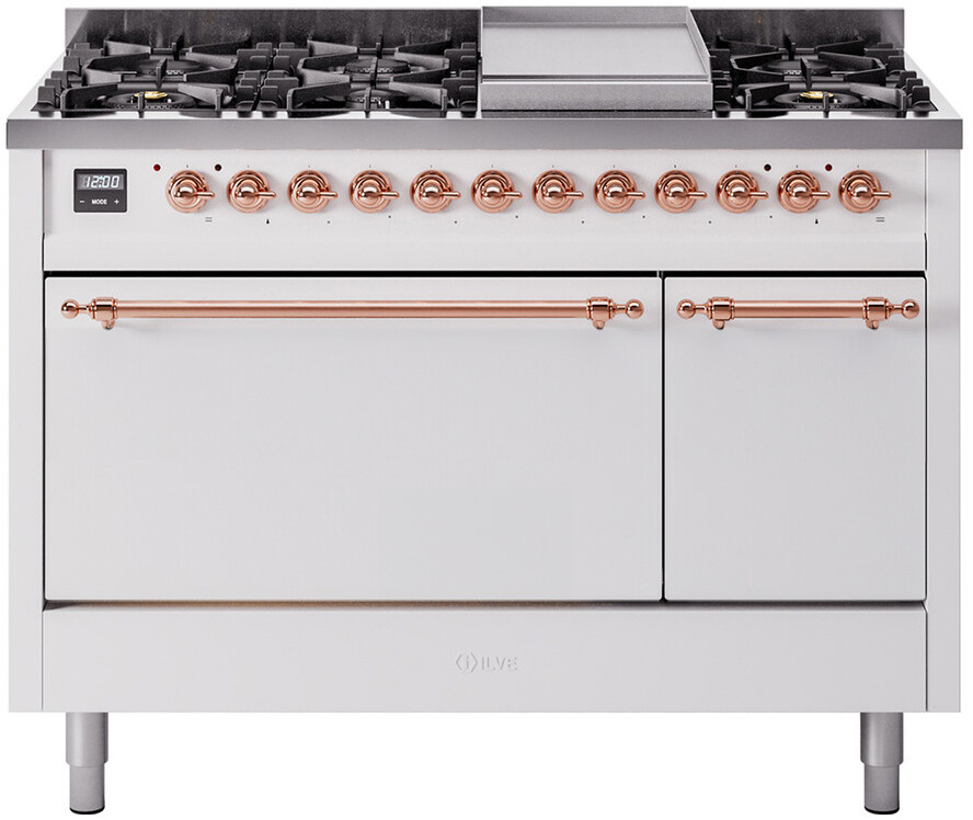 Freestanding Dual Fuel Range with 8 Sealed Burners, 5.02 cu. ft. Total Capacity, Storage Drawer, and Griddle: White, Copper Trim. Enjoy maximum versatility and control with eight sealed burners, perfect for everything from delicate simmering to high-heat searing. With a spacious 5.02 cubic feet oven capacity, you can easily accommodate multiple dishes simultaneously, making it ideal for large families and entertaining. Keep your kitchen organized with the convenient storage drawer, providing extra space for cookware and accessories. The included griddle offers a large, flat cooking surface, perfect for pancakes, sandwiches, and more, adding versatility to your cooking options. With power up to 25000 btu as standard. Optimal supply and perfect distribution of the heat, for all types of cooking. With non-stick nanotechnological treatment. The noble technical characteristics of brass are enriched with a nanotechnological coating that assures easy cleaning, with an elegant Total Black finish. Structure in AISI 304 steel with 12/10 thickness, option to choose the ideal combination between a gas hob with up to 9 burners or induction, mixed and in various setups. The indestructible cast iron pan supports provide a functional and safe support for the pots. The electronic control ensures that the temperature of the oven remains constant throughout, without fluctuating, as is the case in conventional ovens. It can be set with precision starting from 85F, for perfect proofing, up to 575F, for roasting. The door hinges are fitted with a shock absorber that makes the closure more gradual and noiseless. The quick oven preheating function allows it to reach the desired temperature in a short time and you can then choose the best-suited cooking mode for the dish. It also works as rapid defrosting when a low temperature is set (85F - 105F). Pizza function. Quick start. Multiple fan cooking. Intensive cooking. Fan grill cooking. Grill cooking with closed-door. Cooking from above. Cooking from below. Static normal cooking. Grill cooking with closed-door. Cooking from above. Cooking from below. Static normal cooking. Series: Nostalgie II. Fuel Type: Dual Fuel. Gas Type: Natural Gas. Installation Type: Freestanding. Oven Total Capacity (cu. ft.): 5.02. Sabbath Mode: No. Number of Racks: 2. Drawer Type: Storage Drawer. Display Type: LCD Display. Timer: Yes. Cooking Probe: Yes. Rotisserie: Yes. Soft Close Door: Yes. Cooktop Configuration: 8 Sealed Burners + Griddle. Burner/Element Type: Sealed Burner. Griddle: Yes. Grill: No. Oven Control Type: Knobs. Oven Door Type: Solid Door. Number of Ovens: Double Oven. Main Oven Capacity (cu. ft.): 3.5. Second Oven Capacity (cu. ft.): 1.52. Oven Cleaning Type: Easy Clean Enamel Cavities. Main Oven Type: UOV 80 M. Second Oven Type: UOV 30 E. Voltage: 240 V. Amps: 25.8 A. ADA Compliant: No. Star-K Certified: No. Width: 47 7/8". Depth: 25". Height: 38 1/2". Exterior Width: 48".