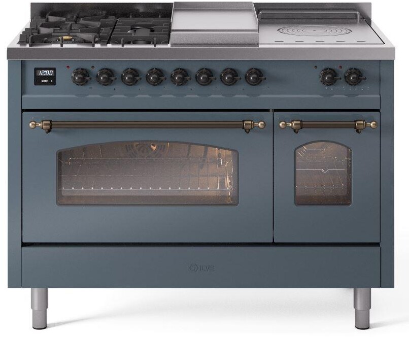 Freestanding Dual Fuel Range with 5 Sealed Burners, 5.02 cu. ft. Total Capacity, Double Oven, Fry Top, Coup de Feu, Storage Drawer, 9 Oven Cooking Functions, Quick Start, Soft Closing Oven Doors, Electronic Temperature Control and Continuous Cast Iron Grates: Blue Grey, Bronze Trim. Enjoy versatile cooking with five sealed burners, providing a range of heat options for everything from gentle simmering to rapid boiling. Cook multiple dishes simultaneously with the spacious 5.02 cubic feet oven capacity, perfect for family meals and entertaining. Keep your kitchen tidy and your essentials within reach with the convenient storage drawer, ideal for storing cookware and accessories. The built-in griddle offers a large, flat cooking surface, perfect for making pancakes, grilling sandwiches, and searing meats. Experience professional-level cooking with the French top, allowing for precise temperature control across a large cooking surface. With power up to 25000 btu as standard. Optimal supply and perfect distribution of the heat, for all types of cooking. With non-stick nanotechnological treatment. The noble technical characteristics of brass are enriched with a nanotechnological coating that assures easy cleaning, with an elegant Total Black finish. Structure in AISI 304 steel with 12/10 thickness, option to choose the ideal combination between a gas hob with up to 9 burners or induction, mixed and in various setups. The indestructible cast iron pan supports provide a functional and safe support for the pots. The electronic control ensures that the temperature of the oven remains constant throughout, without fluctuating, as is the case in conventional ovens. It can be set with precision starting from 85F, for perfect proofing, up to 575F, for roasting. The door hinges are fitted with a shock absorber that makes the closure more gradual and noiseless. The quick oven preheating function allows it to reach the desired temperature in a short time and you can then choose the best-suited cooking mode for the dish. It also works as rapid defrosting when a low temperature is set (85F - 105F). Pizza function. Quick start. Multiple fan cooking. Intensive cooking. Fan grill cooking. Grill cooking with closed-door. Cooking from above. Cooking from below. Static normal cooking. Grill cooking with closed-door. Cooking from above. Cooking from below. Static normal cooking. Series: Nostalgie II. Fuel Type: Dual Fuel. Gas Type: Natural Gas. Installation Type: Freestanding. Oven Total Capacity (cu. ft.): 5.02. Sabbath Mode: No. Number of Racks: 2. Drawer Type: Storage Drawer. Display Type: LCD Display. Timer: Yes. Cooking Probe: Yes. Rotisserie: Yes. Soft Close Door: Yes. Cooktop Configuration: 5 Sealed Burners + Griddle + French Top. Burner/Element Type: Sealed Burner. Griddle: Yes. Grill: No. Oven Control Type: Knobs. Oven Door Type: Triple Glass Door. Number of Ovens: Double Oven. Main Oven Capacity (cu. ft.): 3.5. Second Oven Capacity (cu. ft.): 1.52. Oven Cleaning Type: Easy Clean Enamel Cavities. Main Oven Type: UOV 80 M. Second Oven Type: UOV 30 E. ADA Compliant: No. Star-K Certified: No. Voltage: 240 V. Amps: 25.8 A. Noblesse Frames: No. Width: 47 7/8". Depth: 25 1/2". Height: 36 1/4" - 38 1/2". Exterior Width: 48".