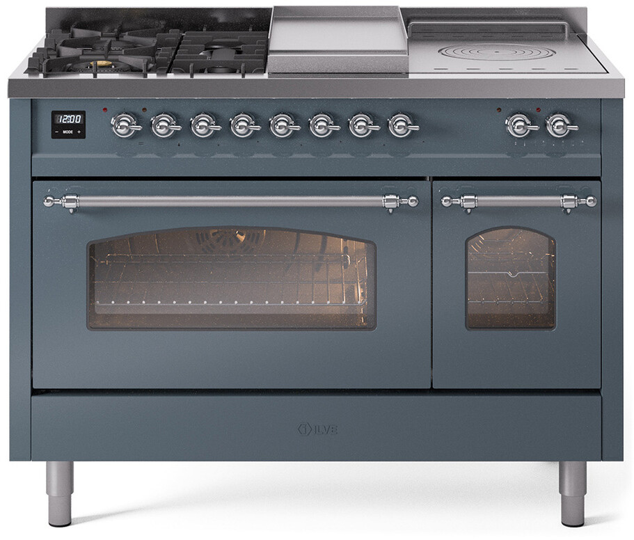 Freestanding Dual Fuel Range with 5 Sealed Burners, 5.02 cu. ft. Total Capacity, Double Oven, Fry Top, Coup de Feu, Storage Drawer, 9 Oven Cooking Functions, Quick Start, Soft Closing Oven Doors, Electronic Temperature Control and Continuous Cast Iron Grates: Blue Grey, Chrome Trim. Enjoy versatile cooking with five sealed burners, providing a range of heat options for everything from gentle simmering to rapid boiling. Cook multiple dishes simultaneously with the spacious 5.02 cubic feet oven capacity, perfect for family meals and entertaining. Keep your kitchen tidy and your essentials within reach with the convenient storage drawer, ideal for storing cookware and accessories. The built-in griddle offers a large, flat cooking surface, perfect for making pancakes, grilling sandwiches, and searing meats. Experience professional-level cooking with the French top, allowing for precise temperature control across a large cooking surface. With power up to 25000 btu as standard. Optimal supply and perfect distribution of the heat, for all types of cooking. With non-stick nanotechnological treatment. The noble technical characteristics of brass are enriched with a nanotechnological coating that assures easy cleaning, with an elegant Total Black finish. Structure in AISI 304 steel with 12/10 thickness, option to choose the ideal combination between a gas hob with up to 9 burners or induction, mixed and in various setups. The indestructible cast iron pan supports provide a functional and safe support for the pots. The electronic control ensures that the temperature of the oven remains constant throughout, without fluctuating, as is the case in conventional ovens. It can be set with precision starting from 85F, for perfect proofing, up to 575F, for roasting. The door hinges are fitted with a shock absorber that makes the closure more gradual and noiseless. The quick oven preheating function allows it to reach the desired temperature in a short time and you can then choose the best-suited cooking mode for the dish. It also works as rapid defrosting when a low temperature is set (85F - 105F). Pizza function. Quick start. Multiple fan cooking. Intensive cooking. Fan grill cooking. Grill cooking with closed-door. Cooking from above. Cooking from below. Static normal cooking. Grill cooking with closed-door. Cooking from above. Cooking from below. Static normal cooking. Series: Nostalgie II. Fuel Type: Dual Fuel. Gas Type: Natural Gas. Installation Type: Freestanding. Oven Total Capacity (cu. ft.): 5.02. Sabbath Mode: No. Number of Racks: 2. Drawer Type: Storage Drawer. Display Type: LCD Display. Timer: Yes. Cooking Probe: Yes. Rotisserie: Yes. Soft Close Door: Yes. Cooktop Configuration: 5 Sealed Burners + Griddle + French Top. Burner/Element Type: Sealed Burner. Griddle: Yes. Grill: No. Oven Control Type: Knobs. Oven Door Type: Triple Glass Door. Number of Ovens: Double Oven. Main Oven Capacity (cu. ft.): 3.5. Second Oven Capacity (cu. ft.): 1.52. Oven Cleaning Type: Easy Clean Enamel Cavities. Main Oven Type: UOV 80 M. Second Oven Type: UOV 30 E. ADA Compliant: No. Star-K Certified: No. Voltage: 240 V. Amps: 25.8 A. Noblesse Frames: No. Width: 47 7/8". Depth: 25 1/2". Height: 36 1/4" - 38 1/2". Exterior Width: 48".