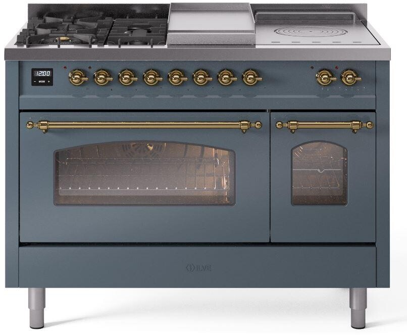 Freestanding Dual Fuel Range with 5 Sealed Burners, 5.02 cu. ft. Total Capacity, Double Oven, Fry Top, Coup de Feu, Storage Drawer, 9 Oven Cooking Functions, Quick Start, Soft Closing Oven Doors, Electronic Temperature Control and Continuous Cast Iron Grates: Blue Grey, Brass Trim. Enjoy versatile cooking with five sealed burners, providing a range of heat options for everything from gentle simmering to rapid boiling. Cook multiple dishes simultaneously with the spacious 5.02 cubic feet oven capacity, perfect for family meals and entertaining. Keep your kitchen tidy and your essentials within reach with the convenient storage drawer, ideal for storing cookware and accessories. The built-in griddle offers a large, flat cooking surface, perfect for making pancakes, grilling sandwiches, and searing meats. Experience professional-level cooking with the French top, allowing for precise temperature control across a large cooking surface. With power up to 25000 btu as standard. Optimal supply and perfect distribution of the heat, for all types of cooking. With non-stick nanotechnological treatment. The noble technical characteristics of brass are enriched with a nanotechnological coating that assures easy cleaning, with an elegant Total Black finish. Structure in AISI 304 steel with 12/10 thickness, option to choose the ideal combination between a gas hob with up to 9 burners or induction, mixed and in various setups. The indestructible cast iron pan supports provide a functional and safe support for the pots. The electronic control ensures that the temperature of the oven remains constant throughout, without fluctuating, as is the case in conventional ovens. It can be set with precision starting from 85F, for perfect proofing, up to 575F, for roasting. The door hinges are fitted with a shock absorber that makes the closure more gradual and noiseless. The quick oven preheating function allows it to reach the desired temperature in a short time and you can then choose the best-suited cooking mode for the dish. It also works as rapid defrosting when a low temperature is set (85F - 105F). Pizza function. Quick start. Multiple fan cooking. Intensive cooking. Fan grill cooking. Grill cooking with closed-door. Cooking from above. Cooking from below. Static normal cooking. Grill cooking with closed-door. Cooking from above. Cooking from below. Static normal cooking. Series: Nostalgie II. Fuel Type: Dual Fuel. Gas Type: Natural Gas. Installation Type: Freestanding. Oven Total Capacity (cu. ft.): 5.02. Sabbath Mode: No. Number of Racks: 2. Drawer Type: Storage Drawer. Display Type: LCD Display. Timer: Yes. Cooking Probe: Yes. Rotisserie: Yes. Soft Close Door: Yes. Cooktop Configuration: 5 Sealed Burners + Griddle + French Top. Burner/Element Type: Sealed Burner. Griddle: Yes. Grill: No. Oven Control Type: Knobs. Oven Door Type: Triple Glass Door. Number of Ovens: Double Oven. Main Oven Capacity (cu. ft.): 3.5. Second Oven Capacity (cu. ft.): 1.52. Oven Cleaning Type: Easy Clean Enamel Cavities. Main Oven Type: UOV 80 M. Second Oven Type: UOV 30 E. ADA Compliant: No. Star-K Certified: No. Voltage: 240 V. Amps: 25.8 A. Noblesse Frames: No. Width: 47 7/8". Depth: 25 1/2". Height: 36 1/4" - 38 1/2". Exterior Width: 48".