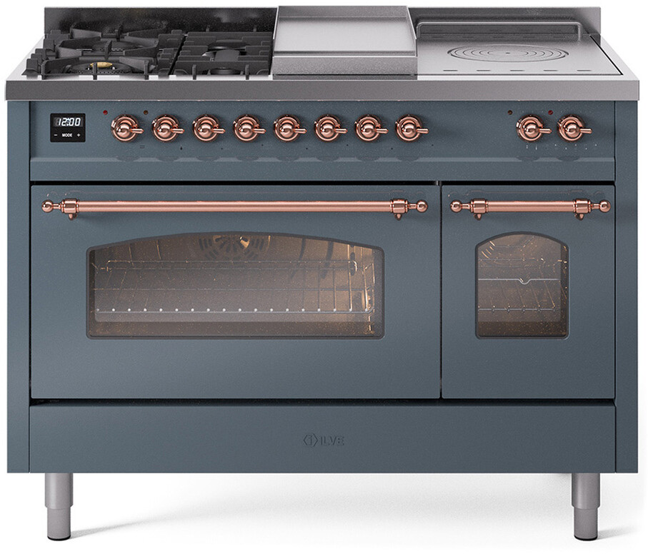 Freestanding Dual Fuel Range with 5 Sealed Burners, 5.02 cu. ft. Total Capacity, Double Oven, Fry Top, Coup de Feu, Storage Drawer, 9 Oven Cooking Functions, Quick Start, Soft Closing Oven Doors, Electronic Temperature Control and Continuous Cast Iron Grates: Blue Grey, Copper Trim. Enjoy versatile cooking with five sealed burners, providing a range of heat options for everything from gentle simmering to rapid boiling. Cook multiple dishes simultaneously with the spacious 5.02 cubic feet oven capacity, perfect for family meals and entertaining. Keep your kitchen tidy and your essentials within reach with the convenient storage drawer, ideal for storing cookware and accessories. The built-in griddle offers a large, flat cooking surface, perfect for making pancakes, grilling sandwiches, and searing meats. Experience professional-level cooking with the French top, allowing for precise temperature control across a large cooking surface. With power up to 25000 btu as standard. Optimal supply and perfect distribution of the heat, for all types of cooking. With non-stick nanotechnological treatment. The noble technical characteristics of brass are enriched with a nanotechnological coating that assures easy cleaning, with an elegant Total Black finish. Structure in AISI 304 steel with 12/10 thickness, option to choose the ideal combination between a gas hob with up to 9 burners or induction, mixed and in various setups. The indestructible cast iron pan supports provide a functional and safe support for the pots. The electronic control ensures that the temperature of the oven remains constant throughout, without fluctuating, as is the case in conventional ovens. It can be set with precision starting from 85F, for perfect proofing, up to 575F, for roasting. The door hinges are fitted with a shock absorber that makes the closure more gradual and noiseless. The quick oven preheating function allows it to reach the desired temperature in a short time and you can then choose the best-suited cooking mode for the dish. It also works as rapid defrosting when a low temperature is set (85F - 105F). Pizza function. Quick start. Multiple fan cooking. Intensive cooking. Fan grill cooking. Grill cooking with closed-door. Cooking from above. Cooking from below. Static normal cooking. Grill cooking with closed-door. Cooking from above. Cooking from below. Static normal cooking. Series: Nostalgie II. Fuel Type: Dual Fuel. Gas Type: Natural Gas. Installation Type: Freestanding. Oven Total Capacity (cu. ft.): 5.02. Sabbath Mode: No. Number of Racks: 2. Drawer Type: Storage Drawer. Display Type: LCD Display. Timer: Yes. Cooking Probe: Yes. Rotisserie: Yes. Soft Close Door: Yes. Cooktop Configuration: 5 Sealed Burners + Griddle + French Top. Burner/Element Type: Sealed Burner. Griddle: Yes. Grill: No. Oven Control Type: Knobs. Oven Door Type: Triple Glass Door. Number of Ovens: Double Oven. Main Oven Capacity (cu. ft.): 3.5. Second Oven Capacity (cu. ft.): 1.52. Oven Cleaning Type: Easy Clean Enamel Cavities. Main Oven Type: UOV 80 M. Second Oven Type: UOV 30 E. ADA Compliant: No. Star-K Certified: No. Voltage: 240 V. Amps: 25.8 A. Noblesse Frames: No. Width: 47 7/8". Depth: 25 1/2". Height: 36 1/4" - 38 1/2". Exterior Width: 48".