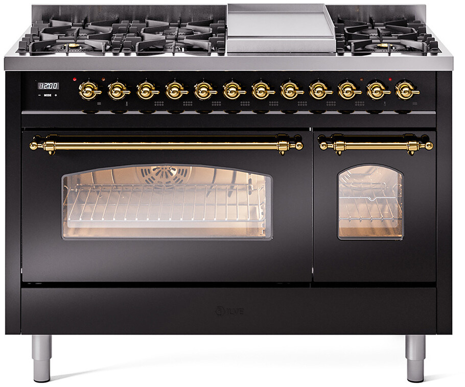 Freestanding Dual Fuel Range with 5 Sealed Burners, 5.02 cu. ft. Total Capacity, Double Oven, Fry Top, Coup de Feu, Storage Drawer, 9 Oven Cooking Functions, Quick Start, Soft Closing Oven Doors, Electronic Temperature Control and Continuous Cast Iron Grates: Glossy Black, Brass Trim. Enjoy versatile cooking with five sealed burners, providing a range of heat options for everything from gentle simmering to rapid boiling. Cook multiple dishes simultaneously with the spacious 5.02 cubic feet oven capacity, perfect for family meals and entertaining. Keep your kitchen tidy and your essentials within reach with the convenient storage drawer, ideal for storing cookware and accessories. The built-in griddle offers a large, flat cooking surface, perfect for making pancakes, grilling sandwiches, and searing meats. Experience professional-level cooking with the French top, allowing for precise temperature control across a large cooking surface. With power up to 25000 btu as standard. Optimal supply and perfect distribution of the heat, for all types of cooking. With non-stick nanotechnological treatment. The noble technical characteristics of brass are enriched with a nanotechnological coating that assures easy cleaning, with an elegant Total Black finish. Structure in AISI 304 steel with 12/10 thickness, option to choose the ideal combination between a gas hob with up to 9 burners or induction, mixed and in various setups. The indestructible cast iron pan supports provide a functional and safe support for the pots. The electronic control ensures that the temperature of the oven remains constant throughout, without fluctuating, as is the case in conventional ovens. It can be set with precision starting from 85F, for perfect proofing, up to 575F, for roasting. The door hinges are fitted with a shock absorber that makes the closure more gradual and noiseless. The quick oven preheating function allows it to reach the desired temperature in a short time and you can then choose the best-suited cooking mode for the dish. It also works as rapid defrosting when a low temperature is set (85F - 105F). Pizza function. Quick start. Multiple fan cooking. Intensive cooking. Fan grill cooking. Grill cooking with closed-door. Cooking from above. Cooking from below. Static normal cooking. Grill cooking with closed-door. Cooking from above. Cooking from below. Static normal cooking. Series: Nostalgie II. Fuel Type: Dual Fuel. Gas Type: Natural Gas. Installation Type: Freestanding. Oven Total Capacity (cu. ft.): 5.02. Sabbath Mode: No. Number of Racks: 2. Drawer Type: Storage Drawer. Display Type: LCD Display. Timer: Yes. Cooking Probe: Yes. Rotisserie: Yes. Soft Close Door: Yes. Cooktop Configuration: 5 Sealed Burners + Griddle + French Top. Burner/Element Type: Sealed Burner. Griddle: Yes. Grill: No. Oven Control Type: Knobs. Oven Door Type: Triple Glass Door. Number of Ovens: Double Oven. Main Oven Capacity (cu. ft.): 3.5. Second Oven Capacity (cu. ft.): 1.52. Oven Cleaning Type: Easy Clean Enamel Cavities. Main Oven Type: UOV 80 M. Second Oven Type: UOV 30 E. ADA Compliant: No. Star-K Certified: No. Voltage: 240 V. Amps: 25.8 A. Noblesse Frames: No. Width: 47 7/8". Depth: 25 1/2". Height: 36 1/4" - 38 1/2". Exterior Width: 48".
