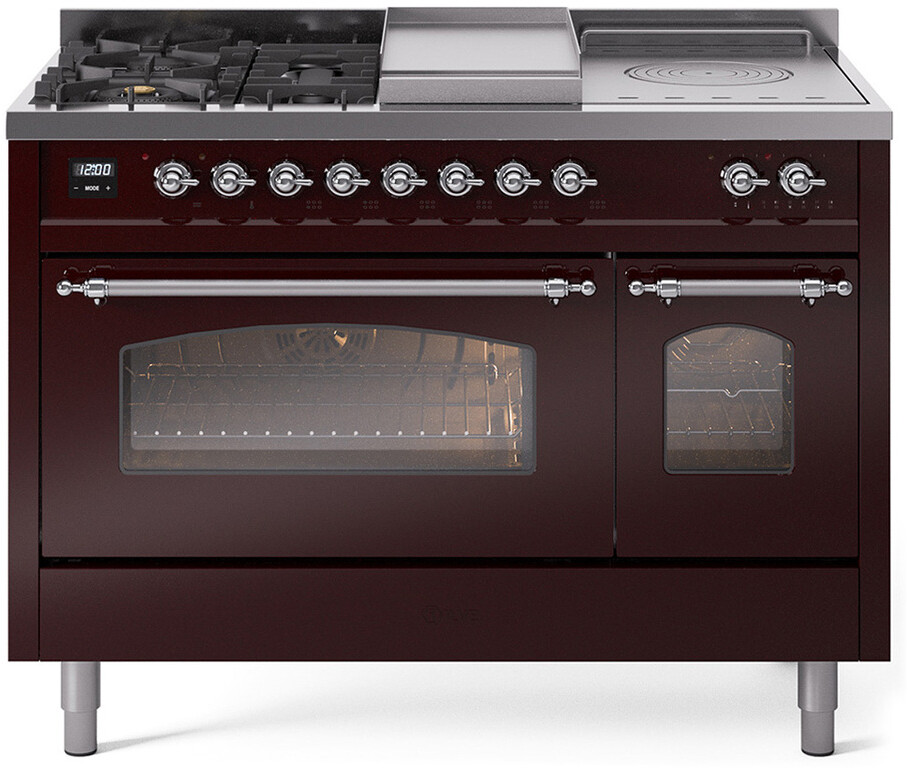Freestanding Dual Fuel Range with 5 Sealed Burners, 5.02 cu. ft. Total Capacity, Double Oven, Fry Top, Coup de Feu, Storage Drawer, 9 Oven Cooking Functions, Quick Start, Soft Closing Oven Doors, Electronic Temperature Control and Continuous Cast Iron Grates: Burgundy, Chrome Trim. Enjoy versatile cooking with five sealed burners, providing a range of heat options for everything from gentle simmering to rapid boiling. Cook multiple dishes simultaneously with the spacious 5.02 cubic feet oven capacity, perfect for family meals and entertaining. Keep your kitchen tidy and your essentials within reach with the convenient storage drawer, ideal for storing cookware and accessories. The built-in griddle offers a large, flat cooking surface, perfect for making pancakes, grilling sandwiches, and searing meats. Experience professional-level cooking with the French top, allowing for precise temperature control across a large cooking surface. With power up to 25000 btu as standard. Optimal supply and perfect distribution of the heat, for all types of cooking. With non-stick nanotechnological treatment. The noble technical characteristics of brass are enriched with a nanotechnological coating that assures easy cleaning, with an elegant Total Black finish. Structure in AISI 304 steel with 12/10 thickness, option to choose the ideal combination between a gas hob with up to 9 burners or induction, mixed and in various setups. The indestructible cast iron pan supports provide a functional and safe support for the pots. The electronic control ensures that the temperature of the oven remains constant throughout, without fluctuating, as is the case in conventional ovens. It can be set with precision starting from 85F, for perfect proofing, up to 575F, for roasting. The door hinges are fitted with a shock absorber that makes the closure more gradual and noiseless. The quick oven preheating function allows it to reach the desired temperature in a short time and you can then choose the best-suited cooking mode for the dish. It also works as rapid defrosting when a low temperature is set (85F - 105F). Pizza function. Quick start. Multiple fan cooking. Intensive cooking. Fan grill cooking. Grill cooking with closed-door. Cooking from above. Cooking from below. Static normal cooking. Grill cooking with closed-door. Cooking from above. Cooking from below. Static normal cooking. Series: Nostalgie II. Fuel Type: Dual Fuel. Gas Type: Natural Gas. Installation Type: Freestanding. Oven Total Capacity (cu. ft.): 5.02. Sabbath Mode: No. Number of Racks: 2. Drawer Type: Storage Drawer. Display Type: LCD Display. Timer: Yes. Cooking Probe: Yes. Rotisserie: Yes. Soft Close Door: Yes. Cooktop Configuration: 5 Sealed Burners + Griddle + French Top. Burner/Element Type: Sealed Burner. Griddle: Yes. Grill: No. Oven Control Type: Knobs. Oven Door Type: Triple Glass Door. Number of Ovens: Double Oven. Main Oven Capacity (cu. ft.): 3.5. Second Oven Capacity (cu. ft.): 1.52. Oven Cleaning Type: Easy Clean Enamel Cavities. Main Oven Type: UOV 80 M. Second Oven Type: UOV 30 E. ADA Compliant: No. Star-K Certified: No. Voltage: 240 V. Amps: 25.8 A. Noblesse Frames: No. Width: 47 7/8". Depth: 25 1/2". Height: 36 1/4" - 38 1/2". Exterior Width: 48".