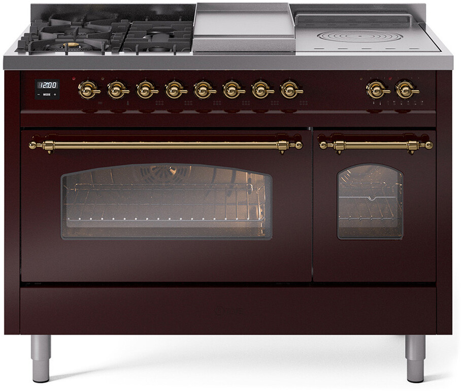 Freestanding Dual Fuel Range with 5 Sealed Burners, 5.02 cu. ft. Total Capacity, Double Oven, Fry Top, Coup de Feu, Storage Drawer, 9 Oven Cooking Functions, Quick Start, Soft Closing Oven Doors, Electronic Temperature Control and Continuous Cast Iron Grates: Burgundy, Brass Trim. Enjoy versatile cooking with five sealed burners, providing a range of heat options for everything from gentle simmering to rapid boiling. Cook multiple dishes simultaneously with the spacious 5.02 cubic feet oven capacity, perfect for family meals and entertaining. Keep your kitchen tidy and your essentials within reach with the convenient storage drawer, ideal for storing cookware and accessories. The built-in griddle offers a large, flat cooking surface, perfect for making pancakes, grilling sandwiches, and searing meats. Experience professional-level cooking with the French top, allowing for precise temperature control across a large cooking surface. With power up to 25000 btu as standard. Optimal supply and perfect distribution of the heat, for all types of cooking. With non-stick nanotechnological treatment. The noble technical characteristics of brass are enriched with a nanotechnological coating that assures easy cleaning, with an elegant Total Black finish. Structure in AISI 304 steel with 12/10 thickness, option to choose the ideal combination between a gas hob with up to 9 burners or induction, mixed and in various setups. The indestructible cast iron pan supports provide a functional and safe support for the pots. The electronic control ensures that the temperature of the oven remains constant throughout, without fluctuating, as is the case in conventional ovens. It can be set with precision starting from 85F, for perfect proofing, up to 575F, for roasting. The door hinges are fitted with a shock absorber that makes the closure more gradual and noiseless. The quick oven preheating function allows it to reach the desired temperature in a short time and you can then choose the best-suited cooking mode for the dish. It also works as rapid defrosting when a low temperature is set (85F - 105F). Pizza function. Quick start. Multiple fan cooking. Intensive cooking. Fan grill cooking. Grill cooking with closed-door. Cooking from above. Cooking from below. Static normal cooking. Grill cooking with closed-door. Cooking from above. Cooking from below. Static normal cooking. Series: Nostalgie II. Fuel Type: Dual Fuel. Gas Type: Natural Gas. Installation Type: Freestanding. Oven Total Capacity (cu. ft.): 5.02. Sabbath Mode: No. Number of Racks: 2. Drawer Type: Storage Drawer. Display Type: LCD Display. Timer: Yes. Cooking Probe: Yes. Rotisserie: Yes. Soft Close Door: Yes. Cooktop Configuration: 5 Sealed Burners + Griddle + French Top. Burner/Element Type: Sealed Burner. Griddle: Yes. Grill: No. Oven Control Type: Knobs. Oven Door Type: Triple Glass Door. Number of Ovens: Double Oven. Main Oven Capacity (cu. ft.): 3.5. Second Oven Capacity (cu. ft.): 1.52. Oven Cleaning Type: Easy Clean Enamel Cavities. Main Oven Type: UOV 80 M. Second Oven Type: UOV 30 E. ADA Compliant: No. Star-K Certified: No. Voltage: 240 V. Amps: 25.8 A. Noblesse Frames: No. Width: 47 7/8". Depth: 25 1/2". Height: 36 1/4" - 38 1/2". Exterior Width: 48".