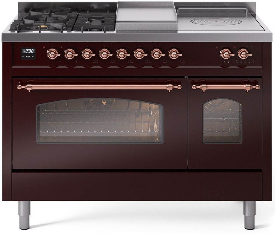 Freestanding Dual Fuel Range with 5 Sealed Burners, 5.02 cu. ft. Total Capacity, Double Oven, Fry Top, Coup de Feu, Storage Drawer, 9 Oven Cooking Functions, Quick Start, Soft Closing Oven Doors, Electronic Temperature Control and Continuous Cast Iron Grates: Burgundy, Copper Trim. Enjoy versatile cooking with five sealed burners, providing a range of heat options for everything from gentle simmering to rapid boiling. Cook multiple dishes simultaneously with the spacious 5.02 cubic feet oven capacity, perfect for family meals and entertaining. Keep your kitchen tidy and your essentials within reach with the convenient storage drawer, ideal for storing cookware and accessories. The built-in griddle offers a large, flat cooking surface, perfect for making pancakes, grilling sandwiches, and searing meats. Experience professional-level cooking with the French top, allowing for precise temperature control across a large cooking surface. With power up to 25000 btu as standard. Optimal supply and perfect distribution of the heat, for all types of cooking. With non-stick nanotechnological treatment. The noble technical characteristics of brass are enriched with a nanotechnological coating that assures easy cleaning, with an elegant Total Black finish. Structure in AISI 304 steel with 12/10 thickness, option to choose the ideal combination between a gas hob with up to 9 burners or induction, mixed and in various setups. The indestructible cast iron pan supports provide a functional and safe support for the pots. The electronic control ensures that the temperature of the oven remains constant throughout, without fluctuating, as is the case in conventional ovens. It can be set with precision starting from 85F, for perfect proofing, up to 575F, for roasting. The door hinges are fitted with a shock absorber that makes the closure more gradual and noiseless. The quick oven preheating function allows it to reach the desired temperature in a short time and you can then choose the best-suited cooking mode for the dish. It also works as rapid defrosting when a low temperature is set (85F - 105F). Pizza function. Quick start. Multiple fan cooking. Intensive cooking. Fan grill cooking. Grill cooking with closed-door. Cooking from above. Cooking from below. Static normal cooking. Grill cooking with closed-door. Cooking from above. Cooking from below. Static normal cooking. Series: Nostalgie II. Fuel Type: Dual Fuel. Gas Type: Natural Gas. Installation Type: Freestanding. Oven Total Capacity (cu. ft.): 5.02. Sabbath Mode: No. Number of Racks: 2. Drawer Type: Storage Drawer. Display Type: LCD Display. Timer: Yes. Cooking Probe: Yes. Rotisserie: Yes. Soft Close Door: Yes. Cooktop Configuration: 5 Sealed Burners + Griddle + French Top. Burner/Element Type: Sealed Burner. Griddle: Yes. Grill: No. Oven Control Type: Knobs. Oven Door Type: Triple Glass Door. Number of Ovens: Double Oven. Main Oven Capacity (cu. ft.): 3.5. Second Oven Capacity (cu. ft.): 1.52. Oven Cleaning Type: Easy Clean Enamel Cavities. Main Oven Type: UOV 80 M. Second Oven Type: UOV 30 E. ADA Compliant: No. Star-K Certified: No. Voltage: 240 V. Amps: 25.8 A. Noblesse Frames: No. Width: 47 7/8". Depth: 25 1/2". Height: 36 1/4" - 38 1/2". Exterior Width: 48".