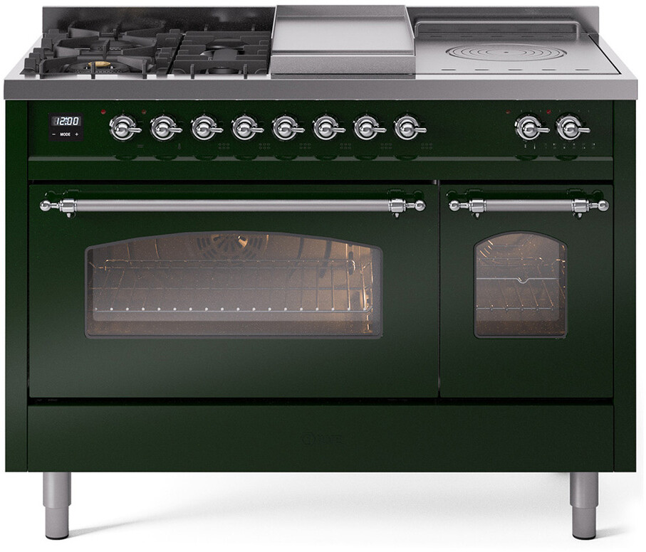Freestanding Dual Fuel Range with 5 Sealed Burners, 5.02 cu. ft. Total Capacity, Double Oven, Fry Top, Coup de Feu, Storage Drawer, 9 Oven Cooking Functions, Quick Start, Soft Closing Oven Doors, Electronic Temperature Control and Continuous Cast Iron Grates: Emerald Green, Chrome Trim. Enjoy versatile cooking with five sealed burners, providing a range of heat options for everything from gentle simmering to rapid boiling. Cook multiple dishes simultaneously with the spacious 5.02 cubic feet oven capacity, perfect for family meals and entertaining. Keep your kitchen tidy and your essentials within reach with the convenient storage drawer, ideal for storing cookware and accessories. The built-in griddle offers a large, flat cooking surface, perfect for making pancakes, grilling sandwiches, and searing meats. Experience professional-level cooking with the French top, allowing for precise temperature control across a large cooking surface. With power up to 25000 btu as standard. Optimal supply and perfect distribution of the heat, for all types of cooking. With non-stick nanotechnological treatment. The noble technical characteristics of brass are enriched with a nanotechnological coating that assures easy cleaning, with an elegant Total Black finish. Structure in AISI 304 steel with 12/10 thickness, option to choose the ideal combination between a gas hob with up to 9 burners or induction, mixed and in various setups. The indestructible cast iron pan supports provide a functional and safe support for the pots. The electronic control ensures that the temperature of the oven remains constant throughout, without fluctuating, as is the case in conventional ovens. It can be set with precision starting from 85F, for perfect proofing, up to 575F, for roasting. The door hinges are fitted with a shock absorber that makes the closure more gradual and noiseless. The quick oven preheating function allows it to reach the desired temperature in a short time and you can then choose the best-suited cooking mode for the dish. It also works as rapid defrosting when a low temperature is set (85F - 105F). Pizza function. Quick start. Multiple fan cooking. Intensive cooking. Fan grill cooking. Grill cooking with closed-door. Cooking from above. Cooking from below. Static normal cooking. Grill cooking with closed-door. Cooking from above. Cooking from below. Static normal cooking. Series: Nostalgie II. Fuel Type: Dual Fuel. Gas Type: Natural Gas. Installation Type: Freestanding. Oven Total Capacity (cu. ft.): 5.02. Sabbath Mode: No. Number of Racks: 2. Drawer Type: Storage Drawer. Display Type: LCD Display. Timer: Yes. Cooking Probe: Yes. Rotisserie: Yes. Soft Close Door: Yes. Cooktop Configuration: 5 Sealed Burners + Griddle + French Top. Burner/Element Type: Sealed Burner. Griddle: Yes. Grill: No. Oven Control Type: Knobs. Oven Door Type: Triple Glass Door. Number of Ovens: Double Oven. Main Oven Capacity (cu. ft.): 3.5. Second Oven Capacity (cu. ft.): 1.52. Oven Cleaning Type: Easy Clean Enamel Cavities. Main Oven Type: UOV 80 M. Second Oven Type: UOV 30 E. ADA Compliant: No. Star-K Certified: No. Voltage: 240 V. Amps: 25.8 A. Noblesse Frames: No. Width: 47 7/8". Depth: 25 1/2". Height: 36 1/4" - 38 1/2". Exterior Width: 48".