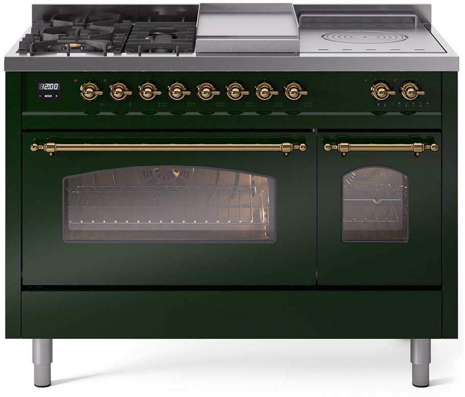 Freestanding Dual Fuel Range with 5 Sealed Burners, 5.02 cu. ft. Total Capacity, Double Oven, Fry Top, Coup de Feu, Storage Drawer, 9 Oven Cooking Functions, Quick Start, Soft Closing Oven Doors, Electronic Temperature Control and Continuous Cast Iron Grates: Emerald Green, Brass Trim. Enjoy versatile cooking with five sealed burners, providing a range of heat options for everything from gentle simmering to rapid boiling. Cook multiple dishes simultaneously with the spacious 5.02 cubic feet oven capacity, perfect for family meals and entertaining. Keep your kitchen tidy and your essentials within reach with the convenient storage drawer, ideal for storing cookware and accessories. The built-in griddle offers a large, flat cooking surface, perfect for making pancakes, grilling sandwiches, and searing meats. Experience professional-level cooking with the French top, allowing for precise temperature control across a large cooking surface. With power up to 25000 btu as standard. Optimal supply and perfect distribution of the heat, for all types of cooking. With non-stick nanotechnological treatment. The noble technical characteristics of brass are enriched with a nanotechnological coating that assures easy cleaning, with an elegant Total Black finish. Structure in AISI 304 steel with 12/10 thickness, option to choose the ideal combination between a gas hob with up to 9 burners or induction, mixed and in various setups. The indestructible cast iron pan supports provide a functional and safe support for the pots. The electronic control ensures that the temperature of the oven remains constant throughout, without fluctuating, as is the case in conventional ovens. It can be set with precision starting from 85F, for perfect proofing, up to 575F, for roasting. The door hinges are fitted with a shock absorber that makes the closure more gradual and noiseless. The quick oven preheating function allows it to reach the desired temperature in a short time and you can then choose the best-suited cooking mode for the dish. It also works as rapid defrosting when a low temperature is set (85F - 105F). Pizza function. Quick start. Multiple fan cooking. Intensive cooking. Fan grill cooking. Grill cooking with closed-door. Cooking from above. Cooking from below. Static normal cooking. Grill cooking with closed-door. Cooking from above. Cooking from below. Static normal cooking. Series: Nostalgie II. Fuel Type: Dual Fuel. Gas Type: Natural Gas. Installation Type: Freestanding. Oven Total Capacity (cu. ft.): 5.02. Sabbath Mode: No. Number of Racks: 2. Drawer Type: Storage Drawer. Display Type: LCD Display. Timer: Yes. Cooking Probe: Yes. Rotisserie: Yes. Soft Close Door: Yes. Cooktop Configuration: 5 Sealed Burners + Griddle + French Top. Burner/Element Type: Sealed Burner. Griddle: Yes. Grill: No. Oven Control Type: Knobs. Oven Door Type: Triple Glass Door. Number of Ovens: Double Oven. Main Oven Capacity (cu. ft.): 3.5. Second Oven Capacity (cu. ft.): 1.52. Oven Cleaning Type: Easy Clean Enamel Cavities. Main Oven Type: UOV 80 M. Second Oven Type: UOV 30 E. ADA Compliant: No. Star-K Certified: No. Voltage: 240 V. Amps: 25.8 A. Noblesse Frames: No. Width: 47 7/8". Depth: 25 1/2". Height: 36 1/4" - 38 1/2". Exterior Width: 48".