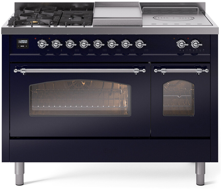 Freestanding Dual Fuel Range with 5 Sealed Burners, 5.02 cu. ft. Total Capacity, Double Oven, Fry Top, Coup de Feu, Storage Drawer, 9 Oven Cooking Functions, Quick Start, Soft Closing Oven Doors, Electronic Temperature Control and Continuous Cast Iron Grates: Midnight Blue, Chrome Trim. Enjoy versatile cooking with five sealed burners, providing a range of heat options for everything from gentle simmering to rapid boiling. Cook multiple dishes simultaneously with the spacious 5.02 cubic feet oven capacity, perfect for family meals and entertaining. Keep your kitchen tidy and your essentials within reach with the convenient storage drawer, ideal for storing cookware and accessories. The built-in griddle offers a large, flat cooking surface, perfect for making pancakes, grilling sandwiches, and searing meats. Experience professional-level cooking with the French top, allowing for precise temperature control across a large cooking surface. With power up to 25000 btu as standard. Optimal supply and perfect distribution of the heat, for all types of cooking. With non-stick nanotechnological treatment. The noble technical characteristics of brass are enriched with a nanotechnological coating that assures easy cleaning, with an elegant Total Black finish. Structure in AISI 304 steel with 12/10 thickness, option to choose the ideal combination between a gas hob with up to 9 burners or induction, mixed and in various setups. The indestructible cast iron pan supports provide a functional and safe support for the pots. The electronic control ensures that the temperature of the oven remains constant throughout, without fluctuating, as is the case in conventional ovens. It can be set with precision starting from 85F, for perfect proofing, up to 575F, for roasting. The door hinges are fitted with a shock absorber that makes the closure more gradual and noiseless. The quick oven preheating function allows it to reach the desired temperature in a short time and you can then choose the best-suited cooking mode for the dish. It also works as rapid defrosting when a low temperature is set (85F - 105F). Pizza function. Quick start. Multiple fan cooking. Intensive cooking. Fan grill cooking. Grill cooking with closed-door. Cooking from above. Cooking from below. Static normal cooking. Grill cooking with closed-door. Cooking from above. Cooking from below. Static normal cooking. Series: Nostalgie II. Fuel Type: Dual Fuel. Gas Type: Natural Gas. Installation Type: Freestanding. Oven Total Capacity (cu. ft.): 5.02. Sabbath Mode: No. Number of Racks: 2. Drawer Type: Storage Drawer. Display Type: LCD Display. Timer: Yes. Cooking Probe: Yes. Rotisserie: Yes. Soft Close Door: Yes. Cooktop Configuration: 5 Sealed Burners + Griddle + French Top. Burner/Element Type: Sealed Burner. Griddle: Yes. Grill: No. Oven Control Type: Knobs. Oven Door Type: Triple Glass Door. Number of Ovens: Double Oven. Main Oven Capacity (cu. ft.): 3.5. Second Oven Capacity (cu. ft.): 1.52. Oven Cleaning Type: Easy Clean Enamel Cavities. Main Oven Type: UOV 80 M. Second Oven Type: UOV 30 E. ADA Compliant: No. Star-K Certified: No. Voltage: 240 V. Amps: 25.8 A. Noblesse Frames: No. Width: 47 7/8". Depth: 25 1/2". Height: 36 1/4" - 38 1/2". Exterior Width: 48".