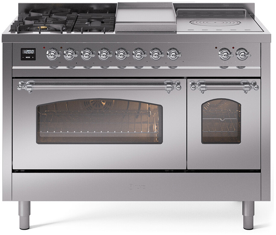 Freestanding Dual Fuel Range with 5 Sealed Burners, 5.02 cu. ft. Total Capacity, Double Oven, Fry Top, Coup de Feu, Storage Drawer, 9 Oven Cooking Functions, Quick Start, Soft Closing Oven Doors, Electronic Temperature Control and Continuous Cast Iron Grates: Stainless Steel, Chrome Trim. Enjoy versatile cooking with five sealed burners, providing a range of heat options for everything from gentle simmering to rapid boiling. Cook multiple dishes simultaneously with the spacious 5.02 cubic feet oven capacity, perfect for family meals and entertaining. Keep your kitchen tidy and your essentials within reach with the convenient storage drawer, ideal for storing cookware and accessories. The built-in griddle offers a large, flat cooking surface, perfect for making pancakes, grilling sandwiches, and searing meats. Experience professional-level cooking with the French top, allowing for precise temperature control across a large cooking surface. With power up to 25000 btu as standard. Optimal supply and perfect distribution of the heat, for all types of cooking. With non-stick nanotechnological treatment. The noble technical characteristics of brass are enriched with a nanotechnological coating that assures easy cleaning, with an elegant Total Black finish. Structure in AISI 304 steel with 12/10 thickness, option to choose the ideal combination between a gas hob with up to 9 burners or induction, mixed and in various setups. The indestructible cast iron pan supports provide a functional and safe support for the pots. The electronic control ensures that the temperature of the oven remains constant throughout, without fluctuating, as is the case in conventional ovens. It can be set with precision starting from 85F, for perfect proofing, up to 575F, for roasting. The door hinges are fitted with a shock absorber that makes the closure more gradual and noiseless. The quick oven preheating function allows it to reach the desired temperature in a short time and you can then choose the best-suited cooking mode for the dish. It also works as rapid defrosting when a low temperature is set (85F - 105F). Pizza function. Quick start. Multiple fan cooking. Intensive cooking. Fan grill cooking. Grill cooking with closed-door. Cooking from above. Cooking from below. Static normal cooking. Grill cooking with closed-door. Cooking from above. Cooking from below. Static normal cooking. Series: Nostalgie II. Fuel Type: Dual Fuel. Gas Type: Natural Gas. Installation Type: Freestanding. Oven Total Capacity (cu. ft.): 5.02. Sabbath Mode: No. Number of Racks: 2. Drawer Type: Storage Drawer. Display Type: LCD Display. Timer: Yes. Cooking Probe: Yes. Rotisserie: Yes. Soft Close Door: Yes. Cooktop Configuration: 5 Sealed Burners + Griddle + French Top. Burner/Element Type: Sealed Burner. Griddle: Yes. Grill: No. Oven Control Type: Knobs. Oven Door Type: Triple Glass Door. Number of Ovens: Double Oven. Main Oven Capacity (cu. ft.): 3.5. Second Oven Capacity (cu. ft.): 1.52. Oven Cleaning Type: Easy Clean Enamel Cavities. Main Oven Type: UOV 80 M. Second Oven Type: UOV 30 E. ADA Compliant: No. Star-K Certified: No. Voltage: 240 V. Amps: 25.8 A. Noblesse Frames: No. Width: 47 7/8". Depth: 25 1/2". Height: 36 1/4" - 38 1/2". Exterior Width: 48".