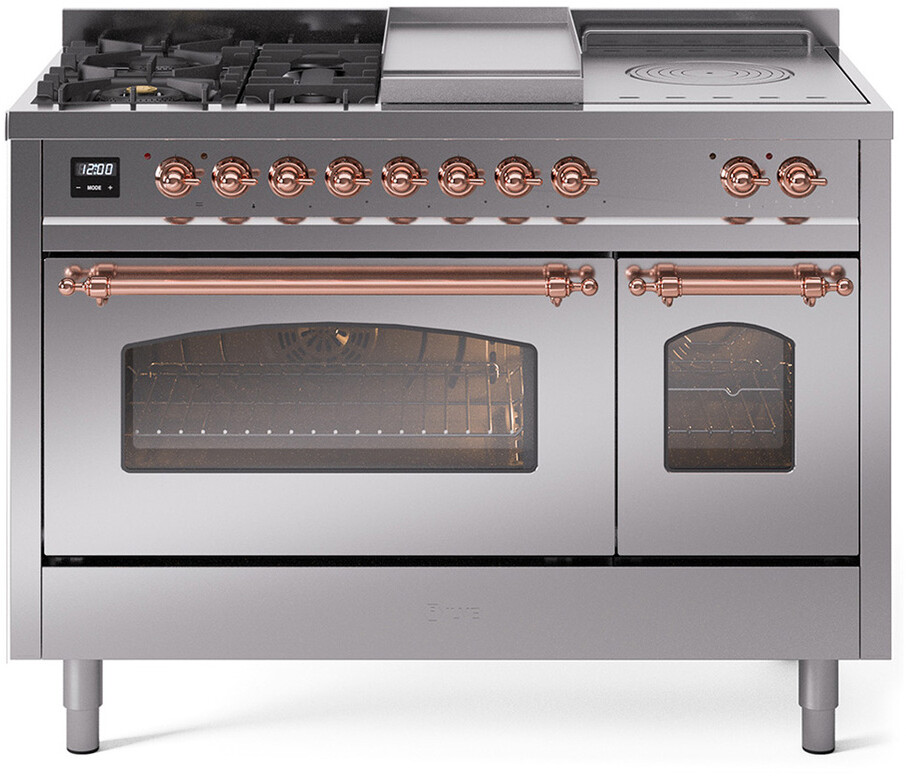 Freestanding Dual Fuel Range with 5 Sealed Burners, 5.02 cu. ft. Total Capacity, Double Oven, Fry Top, Coup de Feu, Storage Drawer, 9 Oven Cooking Functions, Quick Start, Soft Closing Oven Doors, Electronic Temperature Control and Continuous Cast Iron Grates: Stainless Steel, Copper Trim. Enjoy versatile cooking with five sealed burners, providing a range of heat options for everything from gentle simmering to rapid boiling. Cook multiple dishes simultaneously with the spacious 5.02 cubic feet oven capacity, perfect for family meals and entertaining. Keep your kitchen tidy and your essentials within reach with the convenient storage drawer, ideal for storing cookware and accessories. The built-in griddle offers a large, flat cooking surface, perfect for making pancakes, grilling sandwiches, and searing meats. Experience professional-level cooking with the French top, allowing for precise temperature control across a large cooking surface. With power up to 25000 btu as standard. Optimal supply and perfect distribution of the heat, for all types of cooking. With non-stick nanotechnological treatment. The noble technical characteristics of brass are enriched with a nanotechnological coating that assures easy cleaning, with an elegant Total Black finish. Structure in AISI 304 steel with 12/10 thickness, option to choose the ideal combination between a gas hob with up to 9 burners or induction, mixed and in various setups. The indestructible cast iron pan supports provide a functional and safe support for the pots. The electronic control ensures that the temperature of the oven remains constant throughout, without fluctuating, as is the case in conventional ovens. It can be set with precision starting from 85F, for perfect proofing, up to 575F, for roasting. The door hinges are fitted with a shock absorber that makes the closure more gradual and noiseless. The quick oven preheating function allows it to reach the desired temperature in a short time and you can then choose the best-suited cooking mode for the dish. It also works as rapid defrosting when a low temperature is set (85F - 105F). Pizza function. Quick start. Multiple fan cooking. Intensive cooking. Fan grill cooking. Grill cooking with closed-door. Cooking from above. Cooking from below. Static normal cooking. Grill cooking with closed-door. Cooking from above. Cooking from below. Static normal cooking. Series: Nostalgie II. Fuel Type: Dual Fuel. Gas Type: Natural Gas. Installation Type: Freestanding. Oven Total Capacity (cu. ft.): 5.02. Sabbath Mode: No. Number of Racks: 2. Drawer Type: Storage Drawer. Display Type: LCD Display. Timer: Yes. Cooking Probe: Yes. Rotisserie: Yes. Soft Close Door: Yes. Cooktop Configuration: 5 Sealed Burners + Griddle + French Top. Burner/Element Type: Sealed Burner. Griddle: Yes. Grill: No. Oven Control Type: Knobs. Oven Door Type: Triple Glass Door. Number of Ovens: Double Oven. Main Oven Capacity (cu. ft.): 3.5. Second Oven Capacity (cu. ft.): 1.52. Oven Cleaning Type: Easy Clean Enamel Cavities. Main Oven Type: UOV 80 M. Second Oven Type: UOV 30 E. ADA Compliant: No. Star-K Certified: No. Voltage: 240 V. Amps: 25.8 A. Noblesse Frames: No. Width: 47 7/8". Depth: 25 1/2". Height: 36 1/4" - 38 1/2". Exterior Width: 48".