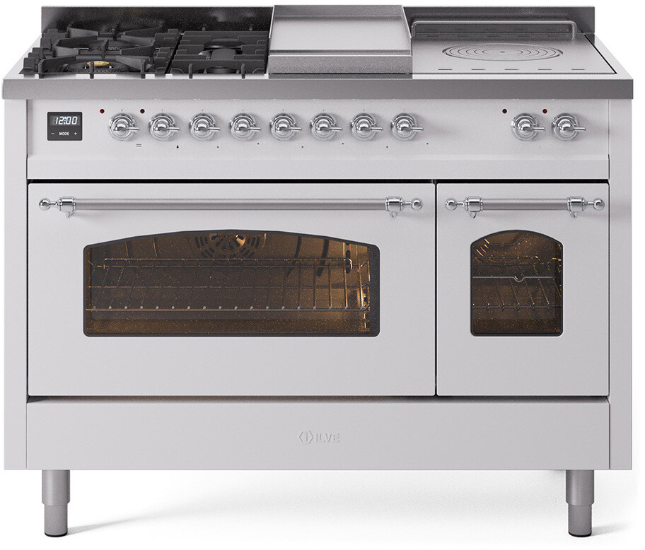 Freestanding Dual Fuel Range with 5 Sealed Burners, 5.02 cu. ft. Total Capacity, Double Oven, Fry Top, Coup de Feu, Storage Drawer, 9 Oven Cooking Functions, Quick Start, Soft Closing Oven Doors, Electronic Temperature Control and Continuous Cast Iron Grates: White, Chrome Trim. Enjoy versatile cooking with five sealed burners, providing a range of heat options for everything from gentle simmering to rapid boiling. Cook multiple dishes simultaneously with the spacious 5.02 cubic feet oven capacity, perfect for family meals and entertaining. Keep your kitchen tidy and your essentials within reach with the convenient storage drawer, ideal for storing cookware and accessories. The built-in griddle offers a large, flat cooking surface, perfect for making pancakes, grilling sandwiches, and searing meats. Experience professional-level cooking with the French top, allowing for precise temperature control across a large cooking surface. With power up to 25000 btu as standard. Optimal supply and perfect distribution of the heat, for all types of cooking. With non-stick nanotechnological treatment. The noble technical characteristics of brass are enriched with a nanotechnological coating that assures easy cleaning, with an elegant Total Black finish. Structure in AISI 304 steel with 12/10 thickness, option to choose the ideal combination between a gas hob with up to 9 burners or induction, mixed and in various setups. The indestructible cast iron pan supports provide a functional and safe support for the pots. The electronic control ensures that the temperature of the oven remains constant throughout, without fluctuating, as is the case in conventional ovens. It can be set with precision starting from 85F, for perfect proofing, up to 575F, for roasting. The door hinges are fitted with a shock absorber that makes the closure more gradual and noiseless. The quick oven preheating function allows it to reach the desired temperature in a short time and you can then choose the best-suited cooking mode for the dish. It also works as rapid defrosting when a low temperature is set (85F - 105F). Pizza function. Quick start. Multiple fan cooking. Intensive cooking. Fan grill cooking. Grill cooking with closed-door. Cooking from above. Cooking from below. Static normal cooking. Grill cooking with closed-door. Cooking from above. Cooking from below. Static normal cooking. Series: Nostalgie II. Fuel Type: Dual Fuel. Gas Type: Natural Gas. Installation Type: Freestanding. Oven Total Capacity (cu. ft.): 5.02. Sabbath Mode: No. Number of Racks: 2. Drawer Type: Storage Drawer. Display Type: LCD Display. Timer: Yes. Cooking Probe: Yes. Rotisserie: Yes. Soft Close Door: Yes. Cooktop Configuration: 5 Sealed Burners + Griddle + French Top. Burner/Element Type: Sealed Burner. Griddle: Yes. Grill: No. Oven Control Type: Knobs. Oven Door Type: Triple Glass Door. Number of Ovens: Double Oven. Main Oven Capacity (cu. ft.): 3.5. Second Oven Capacity (cu. ft.): 1.52. Oven Cleaning Type: Easy Clean Enamel Cavities. Main Oven Type: UOV 80 M. Second Oven Type: UOV 30 E. ADA Compliant: No. Star-K Certified: No. Voltage: 240 V. Amps: 25.8 A. Noblesse Frames: No. Width: 47 7/8". Depth: 25 1/2". Height: 36 1/4" - 38 1/2". Exterior Width: 48".