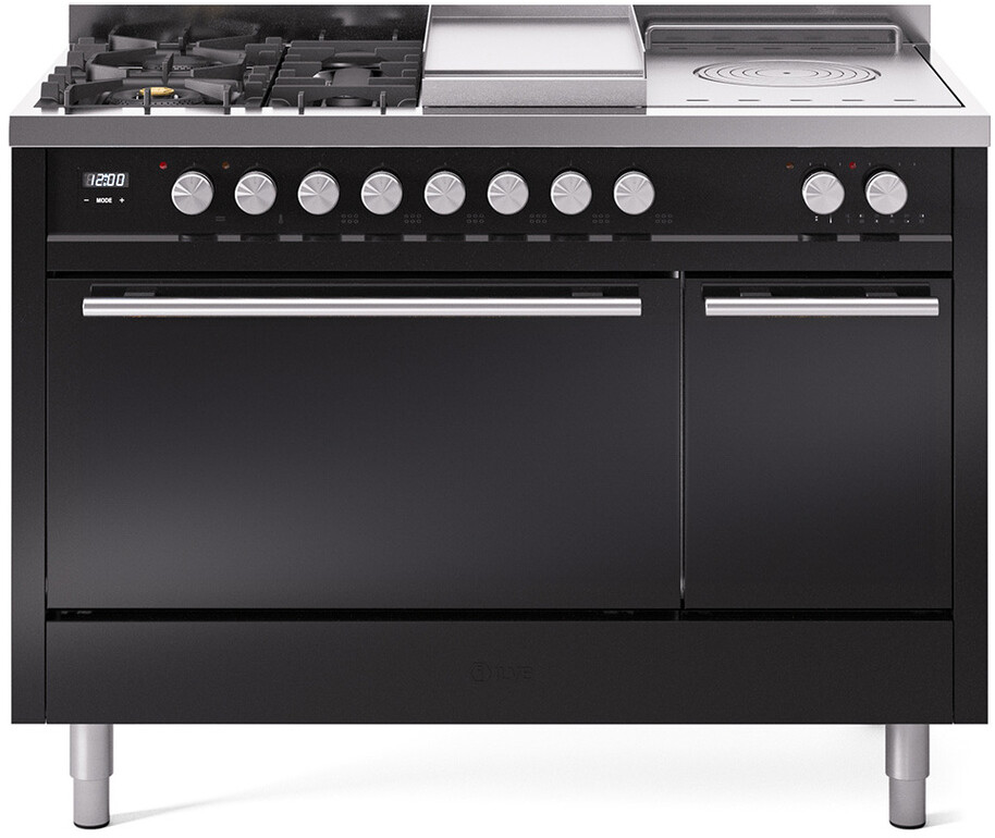 Freestanding Dual Fuel Range with 5 Sealed Burners, 5.02 cu. ft. Total Capacity, Storage Drawer, Griddle and French Top: Glossy Black, NG. Enjoy versatile cooking options with five sealed burners that provide precise control and even heat distribution for all your culinary needs. Cook multiple dishes at once with the spacious 5.02 cubic feet oven capacity, perfect for large family meals and entertaining guests. Keep your kitchen organized with the convenient storage drawer, providing easy access to pots, pans, and cooking utensils. Expand your cooking possibilities with the included griddle, ideal for preparing pancakes, eggs, and grilled sandwiches. Experience gourmet cooking with the French top, offering a versatile surface for simmering, searing, and sauting. With power up to 25000 btu as standard. Optimal supply and perfect distribution of the heat, for all types of cooking. With non-stick nanotechnological treatment. The noble technical characteristics of brass are enriched with a nanotechnological coating that assures easy cleaning, with an elegant Total Black finish. Structure in AISI 304 steel with 12/10 thickness, option to choose the ideal combination between a gas hob with up to 9 burners or induction, mixed and in various setups. The indestructible cast iron pan supports provide a functional and safe support for the pots. The electronic control ensures that the temperature of the oven remains constant throughout, without fluctuating, as is the case in conventional ovens. It can be set with precision starting from 85F, for perfect proofing, up to 575F, for roasting. The door hinges are fitted with a shock absorber that makes the closure more gradual and noiseless. The grease does not stick to the surface and can therefore be cleaned more easily. The quick oven preheating function allows it to reach the desired temperature in a short time and you can then choose the best-suited cooking mode for the dish. It also works as rapid defrosting when a low temperature is set (85F 105F). Pizza function. Quick start. Multiple fan cooking. Intensive cooking. Fan grill cooking. Grill cooking with closed-door. Cooking from above. Cooking from below. Static normal cooking. Grill cooking with closed-door. Cooking from above. Cooking from below. Static normal cooking. Series: Professional Plus II. Fuel Type: Dual Fuel. Gas Type: Natural Gas. Installation Type: Freestanding. Oven Total Capacity (cu. ft.): 5.02. Sabbath Mode: No. Number of Racks: 2. Drawer Type: Storage Drawer. Display Type: LCD Display. Timer: Yes. Cooking Probe: Yes. Rotisserie: Yes. Soft Close Door: Yes. Cooktop Configuration: 5 Sealed Burners + Griddle + French Top. Burner/Element Type: Sealed Burner. Griddle: Yes. Grill: No. Oven Control Type: Knobs. Oven Door Type: Solid Door. Number of Ovens: Double Oven. Main Oven Capacity (cu. ft.): 3.5. Second Oven Capacity (cu. ft.): 1.52. Oven Cleaning Type: Easy Clean Enamel Cavities. Main Oven Type: UOV 80 M. Second Oven Type: UOV 30 E. ADA Compliant: No. Star-K Certified: No. Width: 47 7/8". Depth: 27". Height: 36 1/4" - 38 1/2". Exterior Width: 48".