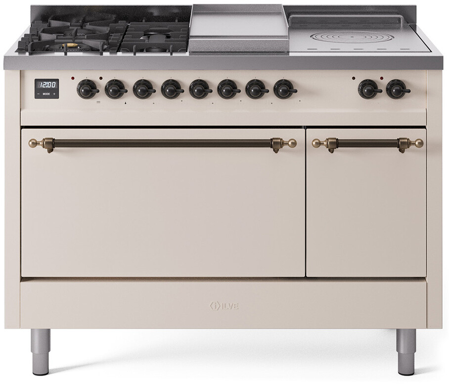 Freestanding Dual Fuel Range with 5 Sealed Burners, 5.02 cu. ft. Total Capacity, Storage Drawer, Griddle, and French Top: Antique White, Bronze Trim, Solid Door. Enjoy versatile cooking options with five sealed burners that provide precise control and even heat distribution for all your culinary needs. Cook multiple dishes at once with the spacious 5.02 cubic feet oven capacity, perfect for large family meals and entertaining guests. Keep your kitchen organized with the convenient storage drawer, providing easy access to pots, pans, and cooking utensils. Expand your cooking possibilities with the included griddle, ideal for preparing pancakes, eggs, and grilled sandwiches. Experience gourmet cooking with the French top, offering a versatile surface for simmering, searing, and sauting. With power up to 25000 btu as standard. Optimal supply and perfect distribution of the heat, for all types of cooking. With non-stick nanotechnological treatment. The noble technical characteristics of brass are enriched with a nanotechnological coating that assures easy cleaning, with an elegant Total Black finish. Structure in AISI 304 steel with 12/10 thickness, option to choose the ideal combination between a gas hob with up to 9 burners or induction, mixed and in various setups. The indestructible cast iron pan supports provide a functional and safe support for the pots. The electronic control ensures that the temperature of the oven remains constant throughout, without fluctuating, as is the case in conventional ovens. It can be set with precision starting from 85F, for perfect proofing, up to 575F, for roasting. The door hinges are fitted with a shock absorber that makes the closure more gradual and noiseless. The quick oven preheating function allows it to reach the desired temperature in a short time and you can then choose the best-suited cooking mode for the dish. It also works as rapid defrosting when a low temperature is set (85F 105F). The grease does not stick to the surface and can therefore be cleaned more easily. Pizza function. Quick start. Multiple fan cooking. Intensive cooking. Fan grill cooking. Grill cooking with closed-door. Cooking from above. Cooking from below. Static normal cooking. Grill cooking with closed-door. Cooking from above. Cooking from below. Static normal cooking. Series: Nostalgie II. Noblesse Frames: No. Fuel Type: Dual Fuel. Gas Type: Natural Gas. Installation Type: Freestanding. Oven Total Capacity (cu. ft.): 5.02. Sabbath Mode: No. Number of Racks: 2. Drawer Type: Storage Drawer. Display Type: LCD Display. Timer: Yes. Cooking Probe: Yes. Rotisserie: Yes. Soft Close Door: Yes. Cooktop Configuration: 5 Sealed Burners + Griddle + French Top. Burner/Element Type: Sealed Burner. Griddle: Yes. Grill: No. Oven Control Type: Knobs. Oven Door Type: Solid Door. Number of Ovens: Double Oven. Main Oven Capacity (cu. ft.): 3.5. Second Oven Capacity (cu. ft.): 1.52. Oven Cleaning Type: Easy Clean Enamel Cavities. Main Oven Type: UOV 80 M. Second Oven Type: UOV 30 E. ADA Compliant: No. Star-K Certified: No. Voltage: 240 V. Amps: 25.8 A. Exterior Width: 48". Width: 47 7/8". Depth: 27". Height: 36 1/4" - 38 1/2".