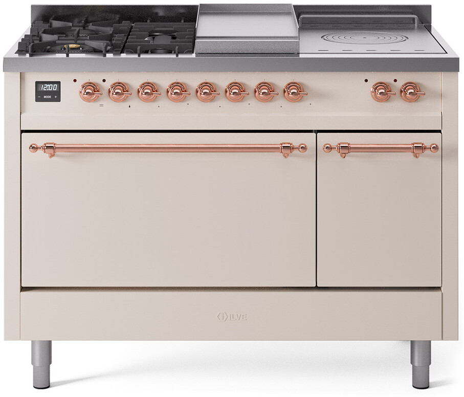 Freestanding Dual Fuel Range with 5 Sealed Burners, 5.02 cu. ft. Total Capacity, Storage Drawer, Griddle, and French Top: Antique White, Copper Trim, Solid Door. Enjoy versatile cooking options with five sealed burners that provide precise control and even heat distribution for all your culinary needs. Cook multiple dishes at once with the spacious 5.02 cubic feet oven capacity, perfect for large family meals and entertaining guests. Keep your kitchen organized with the convenient storage drawer, providing easy access to pots, pans, and cooking utensils. Expand your cooking possibilities with the included griddle, ideal for preparing pancakes, eggs, and grilled sandwiches. Experience gourmet cooking with the French top, offering a versatile surface for simmering, searing, and sauting. With power up to 25000 btu as standard. Optimal supply and perfect distribution of the heat, for all types of cooking. With non-stick nanotechnological treatment. The noble technical characteristics of brass are enriched with a nanotechnological coating that assures easy cleaning, with an elegant Total Black finish. Structure in AISI 304 steel with 12/10 thickness, option to choose the ideal combination between a gas hob with up to 9 burners or induction, mixed and in various setups. The indestructible cast iron pan supports provide a functional and safe support for the pots. The electronic control ensures that the temperature of the oven remains constant throughout, without fluctuating, as is the case in conventional ovens. It can be set with precision starting from 85F, for perfect proofing, up to 575F, for roasting. The door hinges are fitted with a shock absorber that makes the closure more gradual and noiseless. The quick oven preheating function allows it to reach the desired temperature in a short time and you can then choose the best-suited cooking mode for the dish. It also works as rapid defrosting when a low temperature is set (85F 105F). The grease does not stick to the surface and can therefore be cleaned more easily. Pizza function. Quick start. Multiple fan cooking. Intensive cooking. Fan grill cooking. Grill cooking with closed-door. Cooking from above. Cooking from below. Static normal cooking. Grill cooking with closed-door. Cooking from above. Cooking from below. Static normal cooking. Series: Nostalgie II. Noblesse Frames: No. Fuel Type: Dual Fuel. Gas Type: Natural Gas. Installation Type: Freestanding. Oven Total Capacity (cu. ft.): 5.02. Sabbath Mode: No. Number of Racks: 2. Drawer Type: Storage Drawer. Display Type: LCD Display. Timer: Yes. Cooking Probe: Yes. Rotisserie: Yes. Soft Close Door: Yes. Cooktop Configuration: 5 Sealed Burners + Griddle + French Top. Burner/Element Type: Sealed Burner. Griddle: Yes. Grill: No. Oven Control Type: Knobs. Oven Door Type: Solid Door. Number of Ovens: Double Oven. Main Oven Capacity (cu. ft.): 3.5. Second Oven Capacity (cu. ft.): 1.52. Oven Cleaning Type: Easy Clean Enamel Cavities. Main Oven Type: UOV 80 M. Second Oven Type: UOV 30 E. ADA Compliant: No. Star-K Certified: No. Voltage: 240 V. Amps: 25.8 A. Exterior Width: 48". Width: 47 7/8". Depth: 27". Height: 36 1/4" - 38 1/2".