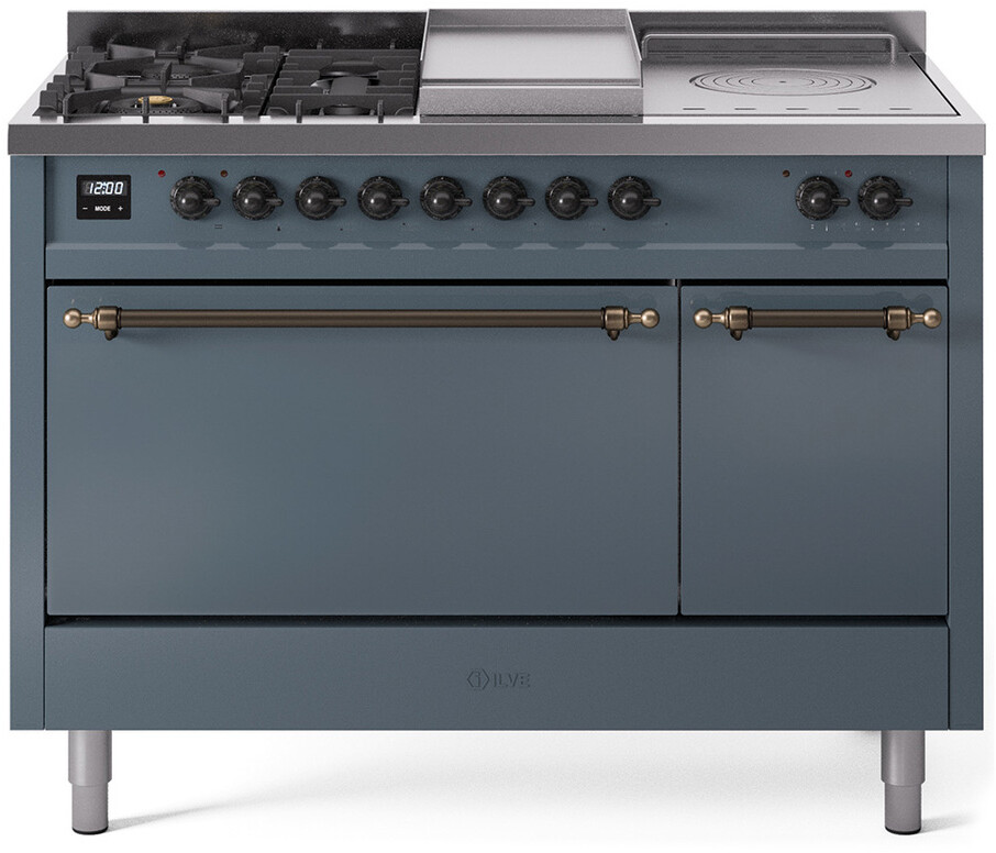 Freestanding Dual Fuel Range with 5 Sealed Burners, 5.02 cu. ft. Total Capacity, Storage Drawer, Griddle, and French Top: Blue Grey, Bronze Trim, Solid Door. Enjoy versatile cooking options with five sealed burners that provide precise control and even heat distribution for all your culinary needs. Cook multiple dishes at once with the spacious 5.02 cubic feet oven capacity, perfect for large family meals and entertaining guests. Keep your kitchen organized with the convenient storage drawer, providing easy access to pots, pans, and cooking utensils. Expand your cooking possibilities with the included griddle, ideal for preparing pancakes, eggs, and grilled sandwiches. Experience gourmet cooking with the French top, offering a versatile surface for simmering, searing, and sauting. With power up to 25000 btu as standard. Optimal supply and perfect distribution of the heat, for all types of cooking. With non-stick nanotechnological treatment. The noble technical characteristics of brass are enriched with a nanotechnological coating that assures easy cleaning, with an elegant Total Black finish. Structure in AISI 304 steel with 12/10 thickness, option to choose the ideal combination between a gas hob with up to 9 burners or induction, mixed and in various setups. The indestructible cast iron pan supports provide a functional and safe support for the pots. The electronic control ensures that the temperature of the oven remains constant throughout, without fluctuating, as is the case in conventional ovens. It can be set with precision starting from 85F, for perfect proofing, up to 575F, for roasting. The door hinges are fitted with a shock absorber that makes the closure more gradual and noiseless. The quick oven preheating function allows it to reach the desired temperature in a short time and you can then choose the best-suited cooking mode for the dish. It also works as rapid defrosting when a low temperature is set (85F 105F). The grease does not stick to the surface and can therefore be cleaned more easily. Pizza function. Quick start. Multiple fan cooking. Intensive cooking. Fan grill cooking. Grill cooking with closed-door. Cooking from above. Cooking from below. Static normal cooking. Grill cooking with closed-door. Cooking from above. Cooking from below. Static normal cooking. Series: Nostalgie II. Noblesse Frames: No. Fuel Type: Dual Fuel. Gas Type: Natural Gas. Installation Type: Freestanding. Oven Total Capacity (cu. ft.): 5.02. Sabbath Mode: No. Number of Racks: 2. Drawer Type: Storage Drawer. Display Type: LCD Display. Timer: Yes. Cooking Probe: Yes. Rotisserie: Yes. Soft Close Door: Yes. Cooktop Configuration: 5 Sealed Burners + Griddle + French Top. Burner/Element Type: Sealed Burner. Griddle: Yes. Grill: No. Oven Control Type: Knobs. Oven Door Type: Solid Door. Number of Ovens: Double Oven. Main Oven Capacity (cu. ft.): 3.5. Second Oven Capacity (cu. ft.): 1.52. Oven Cleaning Type: Easy Clean Enamel Cavities. Main Oven Type: UOV 80 M. Second Oven Type: UOV 30 E. ADA Compliant: No. Star-K Certified: No. Voltage: 240 V. Amps: 25.8 A. Exterior Width: 48". Width: 47 7/8". Depth: 27". Height: 36 1/4" - 38 1/2".