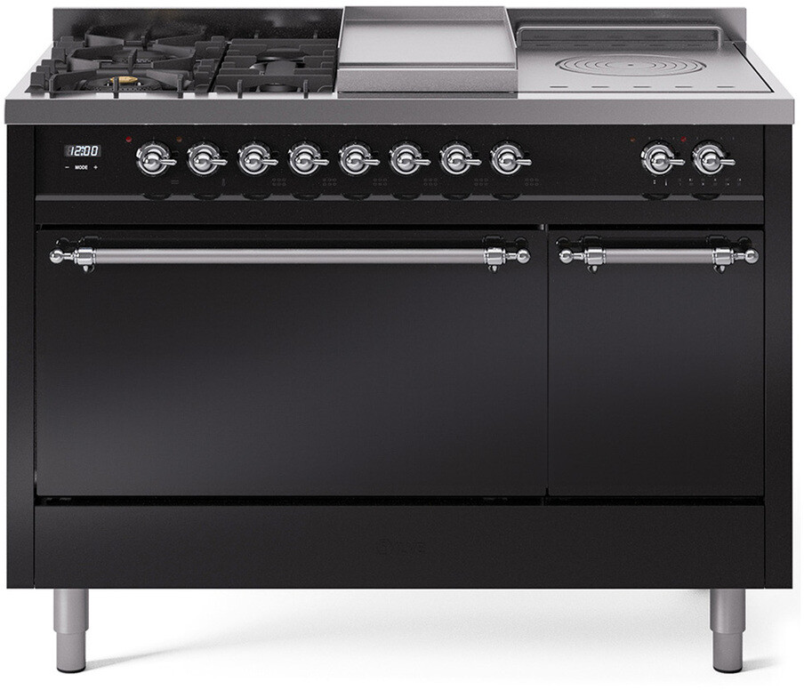 Freestanding Dual Fuel Range with 5 Sealed Burners, 5.02 cu. ft. Total Capacity, Storage Drawer, Griddle, and French Top: Glossy Black, Chrome Trim, Solid Door. Enjoy versatile cooking options with five sealed burners that provide precise control and even heat distribution for all your culinary needs. Cook multiple dishes at once with the spacious 5.02 cubic feet oven capacity, perfect for large family meals and entertaining guests. Keep your kitchen organized with the convenient storage drawer, providing easy access to pots, pans, and cooking utensils. Expand your cooking possibilities with the included griddle, ideal for preparing pancakes, eggs, and grilled sandwiches. Experience gourmet cooking with the French top, offering a versatile surface for simmering, searing, and sauting. With power up to 25000 btu as standard. Optimal supply and perfect distribution of the heat, for all types of cooking. With non-stick nanotechnological treatment. The noble technical characteristics of brass are enriched with a nanotechnological coating that assures easy cleaning, with an elegant Total Black finish. Structure in AISI 304 steel with 12/10 thickness, option to choose the ideal combination between a gas hob with up to 9 burners or induction, mixed and in various setups. The indestructible cast iron pan supports provide a functional and safe support for the pots. The electronic control ensures that the temperature of the oven remains constant throughout, without fluctuating, as is the case in conventional ovens. It can be set with precision starting from 85F, for perfect proofing, up to 575F, for roasting. The door hinges are fitted with a shock absorber that makes the closure more gradual and noiseless. The quick oven preheating function allows it to reach the desired temperature in a short time and you can then choose the best-suited cooking mode for the dish. It also works as rapid defrosting when a low temperature is set (85F 105F). The grease does not stick to the surface and can therefore be cleaned more easily. Pizza function. Quick start. Multiple fan cooking. Intensive cooking. Fan grill cooking. Grill cooking with closed-door. Cooking from above. Cooking from below. Static normal cooking. Grill cooking with closed-door. Cooking from above. Cooking from below. Static normal cooking. Series: Nostalgie II. Noblesse Frames: No. Fuel Type: Dual Fuel. Gas Type: Natural Gas. Installation Type: Freestanding. Oven Total Capacity (cu. ft.): 5.02. Sabbath Mode: No. Number of Racks: 2. Drawer Type: Storage Drawer. Display Type: LCD Display. Timer: Yes. Cooking Probe: Yes. Rotisserie: Yes. Soft Close Door: Yes. Cooktop Configuration: 5 Sealed Burners + Griddle + French Top. Burner/Element Type: Sealed Burner. Griddle: Yes. Grill: No. Oven Control Type: Knobs. Oven Door Type: Solid Door. Number of Ovens: Double Oven. Main Oven Capacity (cu. ft.): 3.5. Second Oven Capacity (cu. ft.): 1.52. Oven Cleaning Type: Easy Clean Enamel Cavities. Main Oven Type: UOV 80 M. Second Oven Type: UOV 30 E. ADA Compliant: No. Star-K Certified: No. Voltage: 240 V. Amps: 25.8 A. Exterior Width: 48". Width: 47 7/8". Depth: 27". Height: 36 1/4" - 38 1/2".