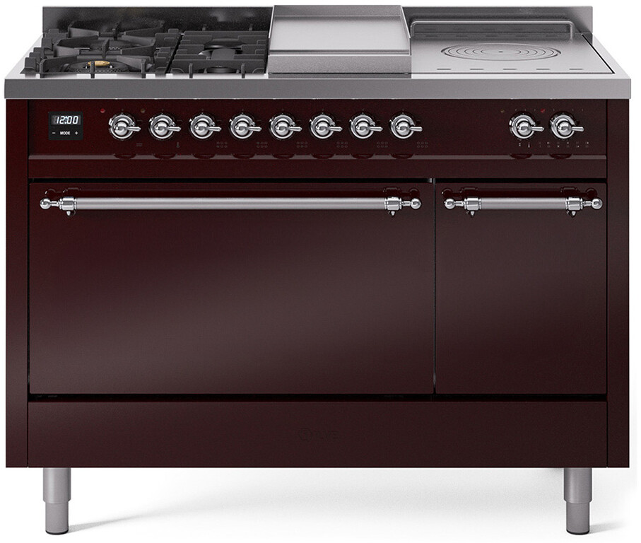 Freestanding Dual Fuel Range with 5 Sealed Burners, 5.02 cu. ft. Total Capacity, Storage Drawer, Griddle, and French Top: Burgundy, Chrome Trim, Solid Door. Enjoy versatile cooking options with five sealed burners that provide precise control and even heat distribution for all your culinary needs. Cook multiple dishes at once with the spacious 5.02 cubic feet oven capacity, perfect for large family meals and entertaining guests. Keep your kitchen organized with the convenient storage drawer, providing easy access to pots, pans, and cooking utensils. Expand your cooking possibilities with the included griddle, ideal for preparing pancakes, eggs, and grilled sandwiches. Experience gourmet cooking with the French top, offering a versatile surface for simmering, searing, and sauting. With power up to 25000 btu as standard. Optimal supply and perfect distribution of the heat, for all types of cooking. With non-stick nanotechnological treatment. The noble technical characteristics of brass are enriched with a nanotechnological coating that assures easy cleaning, with an elegant Total Black finish. Structure in AISI 304 steel with 12/10 thickness, option to choose the ideal combination between a gas hob with up to 9 burners or induction, mixed and in various setups. The indestructible cast iron pan supports provide a functional and safe support for the pots. The electronic control ensures that the temperature of the oven remains constant throughout, without fluctuating, as is the case in conventional ovens. It can be set with precision starting from 85F, for perfect proofing, up to 575F, for roasting. The door hinges are fitted with a shock absorber that makes the closure more gradual and noiseless. The quick oven preheating function allows it to reach the desired temperature in a short time and you can then choose the best-suited cooking mode for the dish. It also works as rapid defrosting when a low temperature is set (85F 105F). The grease does not stick to the surface and can therefore be cleaned more easily. Pizza function. Quick start. Multiple fan cooking. Intensive cooking. Fan grill cooking. Grill cooking with closed-door. Cooking from above. Cooking from below. Static normal cooking. Grill cooking with closed-door. Cooking from above. Cooking from below. Static normal cooking. Series: Nostalgie II. Noblesse Frames: No. Fuel Type: Dual Fuel. Gas Type: Natural Gas. Installation Type: Freestanding. Oven Total Capacity (cu. ft.): 5.02. Sabbath Mode: No. Number of Racks: 2. Drawer Type: Storage Drawer. Display Type: LCD Display. Timer: Yes. Cooking Probe: Yes. Rotisserie: Yes. Soft Close Door: Yes. Cooktop Configuration: 5 Sealed Burners + Griddle + French Top. Burner/Element Type: Sealed Burner. Griddle: Yes. Grill: No. Oven Control Type: Knobs. Oven Door Type: Solid Door. Number of Ovens: Double Oven. Main Oven Capacity (cu. ft.): 3.5. Second Oven Capacity (cu. ft.): 1.52. Oven Cleaning Type: Easy Clean Enamel Cavities. Main Oven Type: UOV 80 M. Second Oven Type: UOV 30 E. ADA Compliant: No. Star-K Certified: No. Voltage: 240 V. Amps: 25.8 A. Exterior Width: 48". Width: 47 7/8". Depth: 27". Height: 36 1/4" - 38 1/2".