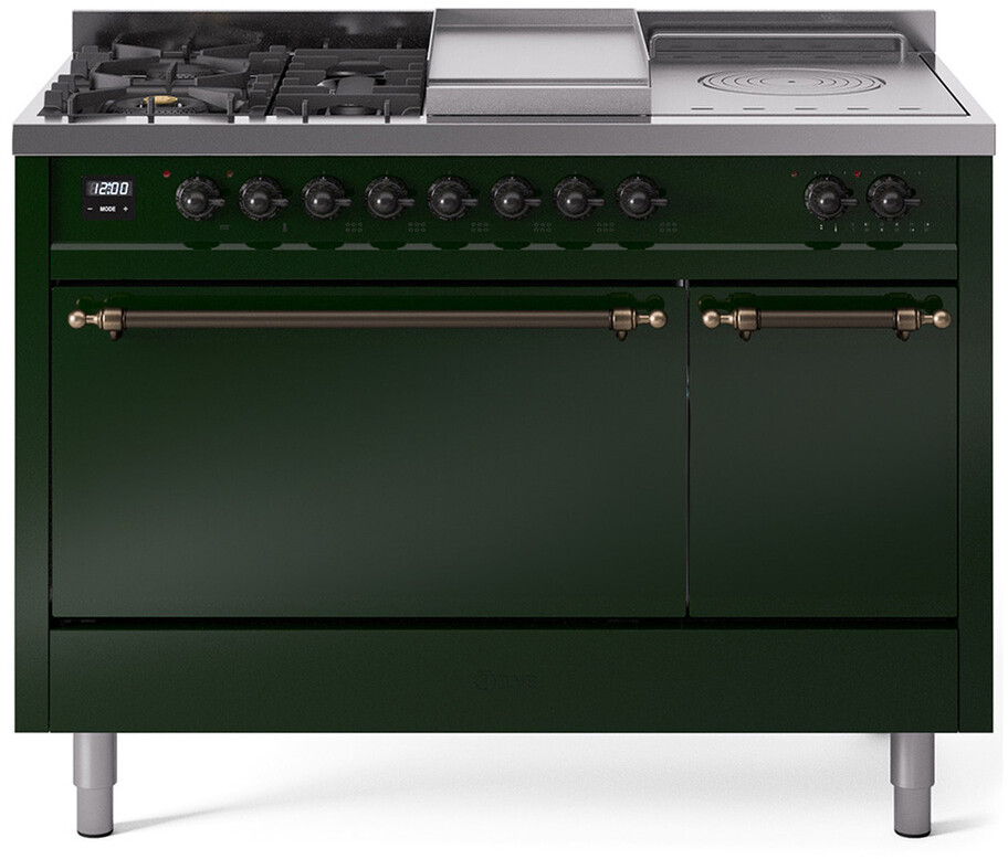 Freestanding Dual Fuel Range with 5 Sealed Burners, 5.02 cu. ft. Total Capacity, Storage Drawer, Griddle, and French Top: Emerald Green, Bronze Trim, Solid Door. Enjoy versatile cooking options with five sealed burners that provide precise control and even heat distribution for all your culinary needs. Cook multiple dishes at once with the spacious 5.02 cubic feet oven capacity, perfect for large family meals and entertaining guests. Keep your kitchen organized with the convenient storage drawer, providing easy access to pots, pans, and cooking utensils. Expand your cooking possibilities with the included griddle, ideal for preparing pancakes, eggs, and grilled sandwiches. Experience gourmet cooking with the French top, offering a versatile surface for simmering, searing, and sauting. With power up to 25000 btu as standard. Optimal supply and perfect distribution of the heat, for all types of cooking. With non-stick nanotechnological treatment. The noble technical characteristics of brass are enriched with a nanotechnological coating that assures easy cleaning, with an elegant Total Black finish. Structure in AISI 304 steel with 12/10 thickness, option to choose the ideal combination between a gas hob with up to 9 burners or induction, mixed and in various setups. The indestructible cast iron pan supports provide a functional and safe support for the pots. The electronic control ensures that the temperature of the oven remains constant throughout, without fluctuating, as is the case in conventional ovens. It can be set with precision starting from 85F, for perfect proofing, up to 575F, for roasting. The door hinges are fitted with a shock absorber that makes the closure more gradual and noiseless. The quick oven preheating function allows it to reach the desired temperature in a short time and you can then choose the best-suited cooking mode for the dish. It also works as rapid defrosting when a low temperature is set (85F 105F). The grease does not stick to the surface and can therefore be cleaned more easily. Pizza function. Quick start. Multiple fan cooking. Intensive cooking. Fan grill cooking. Grill cooking with closed-door. Cooking from above. Cooking from below. Static normal cooking. Grill cooking with closed-door. Cooking from above. Cooking from below. Static normal cooking. Series: Nostalgie II. Noblesse Frames: No. Fuel Type: Dual Fuel. Gas Type: Natural Gas. Installation Type: Freestanding. Oven Total Capacity (cu. ft.): 5.02. Sabbath Mode: No. Number of Racks: 2. Drawer Type: Storage Drawer. Display Type: LCD Display. Timer: Yes. Cooking Probe: Yes. Rotisserie: Yes. Soft Close Door: Yes. Cooktop Configuration: 5 Sealed Burners + Griddle + French Top. Burner/Element Type: Sealed Burner. Griddle: Yes. Grill: No. Oven Control Type: Knobs. Oven Door Type: Solid Door. Number of Ovens: Double Oven. Main Oven Capacity (cu. ft.): 3.5. Second Oven Capacity (cu. ft.): 1.52. Oven Cleaning Type: Easy Clean Enamel Cavities. Main Oven Type: UOV 80 M. Second Oven Type: UOV 30 E. ADA Compliant: No. Star-K Certified: No. Voltage: 240 V. Amps: 25.8 A. Exterior Width: 48". Width: 47 7/8". Depth: 27". Height: 36 1/4" - 38 1/2".
