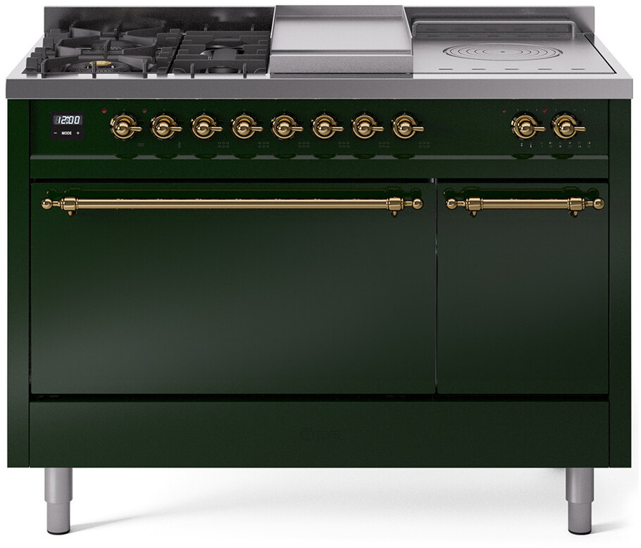 Freestanding Dual Fuel Range with 5 Sealed Burners, 5.02 cu. ft. Total Capacity, Storage Drawer, Griddle, and French Top: Emerald Green, Brass Trim, Solid Door. Enjoy versatile cooking options with five sealed burners that provide precise control and even heat distribution for all your culinary needs. Cook multiple dishes at once with the spacious 5.02 cubic feet oven capacity, perfect for large family meals and entertaining guests. Keep your kitchen organized with the convenient storage drawer, providing easy access to pots, pans, and cooking utensils. Expand your cooking possibilities with the included griddle, ideal for preparing pancakes, eggs, and grilled sandwiches. Experience gourmet cooking with the French top, offering a versatile surface for simmering, searing, and sauting. With power up to 25000 btu as standard. Optimal supply and perfect distribution of the heat, for all types of cooking. With non-stick nanotechnological treatment. The noble technical characteristics of brass are enriched with a nanotechnological coating that assures easy cleaning, with an elegant Total Black finish. Structure in AISI 304 steel with 12/10 thickness, option to choose the ideal combination between a gas hob with up to 9 burners or induction, mixed and in various setups. The indestructible cast iron pan supports provide a functional and safe support for the pots. The electronic control ensures that the temperature of the oven remains constant throughout, without fluctuating, as is the case in conventional ovens. It can be set with precision starting from 85F, for perfect proofing, up to 575F, for roasting. The door hinges are fitted with a shock absorber that makes the closure more gradual and noiseless. The quick oven preheating function allows it to reach the desired temperature in a short time and you can then choose the best-suited cooking mode for the dish. It also works as rapid defrosting when a low temperature is set (85F 105F). The grease does not stick to the surface and can therefore be cleaned more easily. Pizza function. Quick start. Multiple fan cooking. Intensive cooking. Fan grill cooking. Grill cooking with closed-door. Cooking from above. Cooking from below. Static normal cooking. Grill cooking with closed-door. Cooking from above. Cooking from below. Static normal cooking. Series: Nostalgie II. Noblesse Frames: No. Fuel Type: Dual Fuel. Gas Type: Natural Gas. Installation Type: Freestanding. Oven Total Capacity (cu. ft.): 5.02. Sabbath Mode: No. Number of Racks: 2. Drawer Type: Storage Drawer. Display Type: LCD Display. Timer: Yes. Cooking Probe: Yes. Rotisserie: Yes. Soft Close Door: Yes. Cooktop Configuration: 5 Sealed Burners + Griddle + French Top. Burner/Element Type: Sealed Burner. Griddle: Yes. Grill: No. Oven Control Type: Knobs. Oven Door Type: Solid Door. Number of Ovens: Double Oven. Main Oven Capacity (cu. ft.): 3.5. Second Oven Capacity (cu. ft.): 1.52. Oven Cleaning Type: Easy Clean Enamel Cavities. Main Oven Type: UOV 80 M. Second Oven Type: UOV 30 E. ADA Compliant: No. Star-K Certified: No. Voltage: 240 V. Amps: 25.8 A. Exterior Width: 48". Width: 47 7/8". Depth: 27". Height: 36 1/4" - 38 1/2".