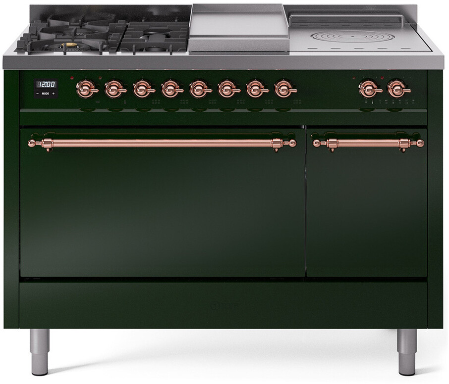 Freestanding Dual Fuel Range with 5 Sealed Burners, 5.02 cu. ft. Total Capacity, Storage Drawer, Griddle, and French Top: Emerald Green, Copper Trim, Solid Door. Enjoy versatile cooking options with five sealed burners that provide precise control and even heat distribution for all your culinary needs. Cook multiple dishes at once with the spacious 5.02 cubic feet oven capacity, perfect for large family meals and entertaining guests. Keep your kitchen organized with the convenient storage drawer, providing easy access to pots, pans, and cooking utensils. Expand your cooking possibilities with the included griddle, ideal for preparing pancakes, eggs, and grilled sandwiches. Experience gourmet cooking with the French top, offering a versatile surface for simmering, searing, and sauting. With power up to 25000 btu as standard. Optimal supply and perfect distribution of the heat, for all types of cooking. With non-stick nanotechnological treatment. The noble technical characteristics of brass are enriched with a nanotechnological coating that assures easy cleaning, with an elegant Total Black finish. Structure in AISI 304 steel with 12/10 thickness, option to choose the ideal combination between a gas hob with up to 9 burners or induction, mixed and in various setups. The indestructible cast iron pan supports provide a functional and safe support for the pots. The electronic control ensures that the temperature of the oven remains constant throughout, without fluctuating, as is the case in conventional ovens. It can be set with precision starting from 85F, for perfect proofing, up to 575F, for roasting. The door hinges are fitted with a shock absorber that makes the closure more gradual and noiseless. The quick oven preheating function allows it to reach the desired temperature in a short time and you can then choose the best-suited cooking mode for the dish. It also works as rapid defrosting when a low temperature is set (85F 105F). The grease does not stick to the surface and can therefore be cleaned more easily. Pizza function. Quick start. Multiple fan cooking. Intensive cooking. Fan grill cooking. Grill cooking with closed-door. Cooking from above. Cooking from below. Static normal cooking. Grill cooking with closed-door. Cooking from above. Cooking from below. Static normal cooking. Series: Nostalgie II. Noblesse Frames: No. Fuel Type: Dual Fuel. Gas Type: Natural Gas. Installation Type: Freestanding. Oven Total Capacity (cu. ft.): 5.02. Sabbath Mode: No. Number of Racks: 2. Drawer Type: Storage Drawer. Display Type: LCD Display. Timer: Yes. Cooking Probe: Yes. Rotisserie: Yes. Soft Close Door: Yes. Cooktop Configuration: 5 Sealed Burners + Griddle + French Top. Burner/Element Type: Sealed Burner. Griddle: Yes. Grill: No. Oven Control Type: Knobs. Oven Door Type: Solid Door. Number of Ovens: Double Oven. Main Oven Capacity (cu. ft.): 3.5. Second Oven Capacity (cu. ft.): 1.52. Oven Cleaning Type: Easy Clean Enamel Cavities. Main Oven Type: UOV 80 M. Second Oven Type: UOV 30 E. ADA Compliant: No. Star-K Certified: No. Voltage: 240 V. Amps: 25.8 A. Exterior Width: 48". Width: 47 7/8". Depth: 27". Height: 36 1/4" - 38 1/2".