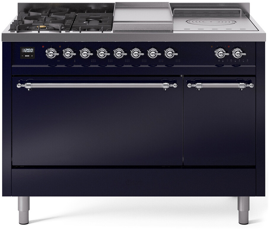 Freestanding Dual Fuel Range with 5 Sealed Burners, 5.02 cu. ft. Total Capacity, Storage Drawer, Griddle, and French Top: Midnight Blue, Chrome Trim, Solid Door. Enjoy versatile cooking options with five sealed burners that provide precise control and even heat distribution for all your culinary needs. Cook multiple dishes at once with the spacious 5.02 cubic feet oven capacity, perfect for large family meals and entertaining guests. Keep your kitchen organized with the convenient storage drawer, providing easy access to pots, pans, and cooking utensils. Expand your cooking possibilities with the included griddle, ideal for preparing pancakes, eggs, and grilled sandwiches. Experience gourmet cooking with the French top, offering a versatile surface for simmering, searing, and sauting. With power up to 25000 btu as standard. Optimal supply and perfect distribution of the heat, for all types of cooking. With non-stick nanotechnological treatment. The noble technical characteristics of brass are enriched with a nanotechnological coating that assures easy cleaning, with an elegant Total Black finish. Structure in AISI 304 steel with 12/10 thickness, option to choose the ideal combination between a gas hob with up to 9 burners or induction, mixed and in various setups. The indestructible cast iron pan supports provide a functional and safe support for the pots. The electronic control ensures that the temperature of the oven remains constant throughout, without fluctuating, as is the case in conventional ovens. It can be set with precision starting from 85F, for perfect proofing, up to 575F, for roasting. The door hinges are fitted with a shock absorber that makes the closure more gradual and noiseless. The quick oven preheating function allows it to reach the desired temperature in a short time and you can then choose the best-suited cooking mode for the dish. It also works as rapid defrosting when a low temperature is set (85F 105F). The grease does not stick to the surface and can therefore be cleaned more easily. Pizza function. Quick start. Multiple fan cooking. Intensive cooking. Fan grill cooking. Grill cooking with closed-door. Cooking from above. Cooking from below. Static normal cooking. Grill cooking with closed-door. Cooking from above. Cooking from below. Static normal cooking. Series: Nostalgie II. Noblesse Frames: No. Fuel Type: Dual Fuel. Gas Type: Natural Gas. Installation Type: Freestanding. Oven Total Capacity (cu. ft.): 5.02. Sabbath Mode: No. Number of Racks: 2. Drawer Type: Storage Drawer. Display Type: LCD Display. Timer: Yes. Cooking Probe: Yes. Rotisserie: Yes. Soft Close Door: Yes. Cooktop Configuration: 5 Sealed Burners + Griddle + French Top. Burner/Element Type: Sealed Burner. Griddle: Yes. Grill: No. Oven Control Type: Knobs. Oven Door Type: Solid Door. Number of Ovens: Double Oven. Main Oven Capacity (cu. ft.): 3.5. Second Oven Capacity (cu. ft.): 1.52. Oven Cleaning Type: Easy Clean Enamel Cavities. Main Oven Type: UOV 80 M. Second Oven Type: UOV 30 E. ADA Compliant: No. Star-K Certified: No. Voltage: 240 V. Amps: 25.8 A. Exterior Width: 48". Width: 47 7/8". Depth: 27". Height: 36 1/4" - 38 1/2".