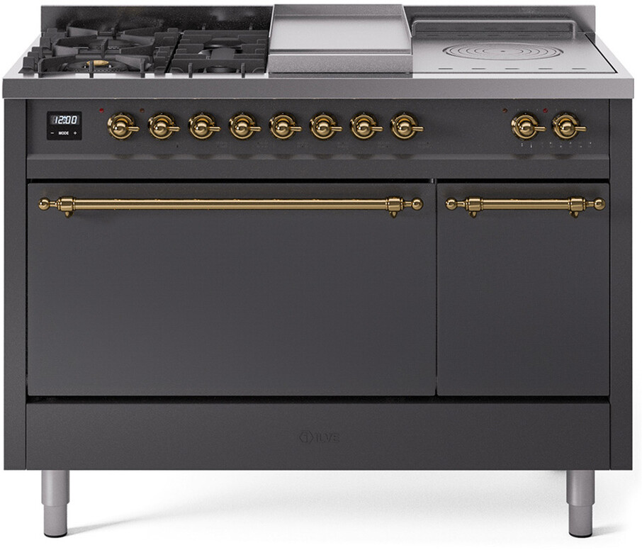 Freestanding Dual Fuel Range with 5 Sealed Burners, 5.02 cu. ft. Total Capacity, Storage Drawer, Griddle, and French Top: Graphite Matte, Brass Trim, Solid Door. Enjoy versatile cooking options with five sealed burners that provide precise control and even heat distribution for all your culinary needs. Cook multiple dishes at once with the spacious 5.02 cubic feet oven capacity, perfect for large family meals and entertaining guests. Keep your kitchen organized with the convenient storage drawer, providing easy access to pots, pans, and cooking utensils. Expand your cooking possibilities with the included griddle, ideal for preparing pancakes, eggs, and grilled sandwiches. Experience gourmet cooking with the French top, offering a versatile surface for simmering, searing, and sauting. With power up to 25000 btu as standard. Optimal supply and perfect distribution of the heat, for all types of cooking. With non-stick nanotechnological treatment. The noble technical characteristics of brass are enriched with a nanotechnological coating that assures easy cleaning, with an elegant Total Black finish. Structure in AISI 304 steel with 12/10 thickness, option to choose the ideal combination between a gas hob with up to 9 burners or induction, mixed and in various setups. The indestructible cast iron pan supports provide a functional and safe support for the pots. The electronic control ensures that the temperature of the oven remains constant throughout, without fluctuating, as is the case in conventional ovens. It can be set with precision starting from 85F, for perfect proofing, up to 575F, for roasting. The door hinges are fitted with a shock absorber that makes the closure more gradual and noiseless. The quick oven preheating function allows it to reach the desired temperature in a short time and you can then choose the best-suited cooking mode for the dish. It also works as rapid defrosting when a low temperature is set (85F 105F). The grease does not stick to the surface and can therefore be cleaned more easily. Pizza function. Quick start. Multiple fan cooking. Intensive cooking. Fan grill cooking. Grill cooking with closed-door. Cooking from above. Cooking from below. Static normal cooking. Grill cooking with closed-door. Cooking from above. Cooking from below. Static normal cooking. Series: Nostalgie II. Noblesse Frames: No. Fuel Type: Dual Fuel. Gas Type: Natural Gas. Installation Type: Freestanding. Oven Total Capacity (cu. ft.): 5.02. Sabbath Mode: No. Number of Racks: 2. Drawer Type: Storage Drawer. Display Type: LCD Display. Timer: Yes. Cooking Probe: Yes. Rotisserie: Yes. Soft Close Door: Yes. Cooktop Configuration: 5 Sealed Burners + Griddle + French Top. Burner/Element Type: Sealed Burner. Griddle: Yes. Grill: No. Oven Control Type: Knobs. Oven Door Type: Solid Door. Number of Ovens: Double Oven. Main Oven Capacity (cu. ft.): 3.5. Second Oven Capacity (cu. ft.): 1.52. Oven Cleaning Type: Easy Clean Enamel Cavities. Main Oven Type: UOV 80 M. Second Oven Type: UOV 30 E. ADA Compliant: No. Star-K Certified: No. Voltage: 240 V. Amps: 25.8 A. Exterior Width: 48". Width: 47 7/8". Depth: 27". Height: 36 1/4" - 38 1/2".
