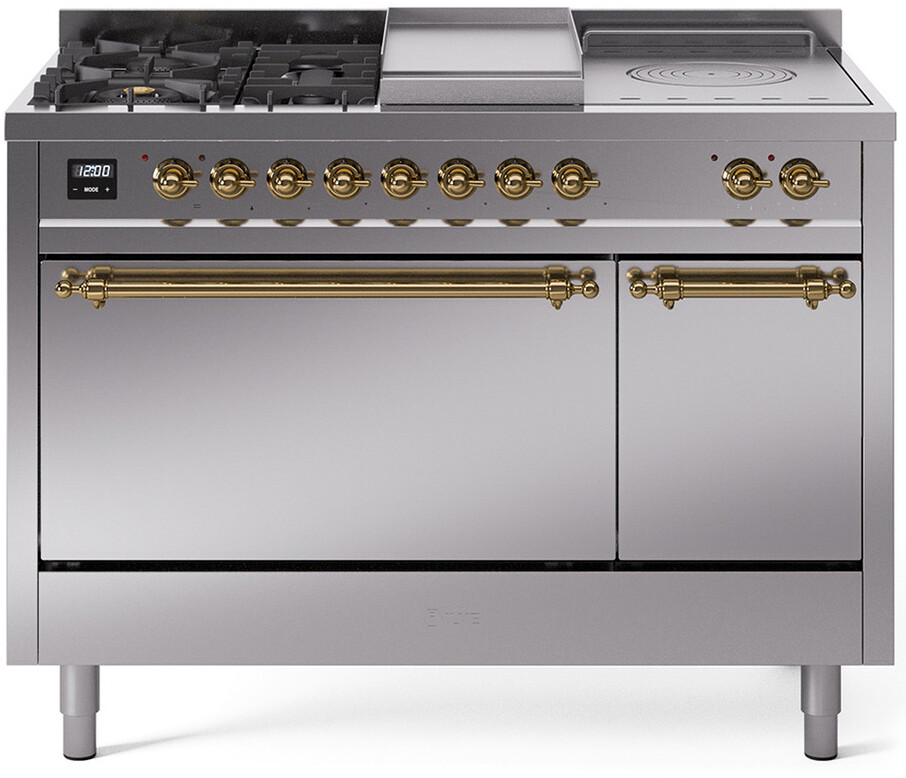 Freestanding Dual Fuel Range with 5 Sealed Burners, 5.02 cu. ft. Total Capacity, Storage Drawer, Griddle, and French Top: Stainless Steel, Brass Trim, Solid Door. Enjoy versatile cooking options with five sealed burners that provide precise control and even heat distribution for all your culinary needs. Cook multiple dishes at once with the spacious 5.02 cubic feet oven capacity, perfect for large family meals and entertaining guests. Keep your kitchen organized with the convenient storage drawer, providing easy access to pots, pans, and cooking utensils. Expand your cooking possibilities with the included griddle, ideal for preparing pancakes, eggs, and grilled sandwiches. Experience gourmet cooking with the French top, offering a versatile surface for simmering, searing, and sauting. With power up to 25000 btu as standard. Optimal supply and perfect distribution of the heat, for all types of cooking. With non-stick nanotechnological treatment. The noble technical characteristics of brass are enriched with a nanotechnological coating that assures easy cleaning, with an elegant Total Black finish. Structure in AISI 304 steel with 12/10 thickness, option to choose the ideal combination between a gas hob with up to 9 burners or induction, mixed and in various setups. The indestructible cast iron pan supports provide a functional and safe support for the pots. The electronic control ensures that the temperature of the oven remains constant throughout, without fluctuating, as is the case in conventional ovens. It can be set with precision starting from 85F, for perfect proofing, up to 575F, for roasting. The door hinges are fitted with a shock absorber that makes the closure more gradual and noiseless. The quick oven preheating function allows it to reach the desired temperature in a short time and you can then choose the best-suited cooking mode for the dish. It also works as rapid defrosting when a low temperature is set (85F 105F). The grease does not stick to the surface and can therefore be cleaned more easily. Pizza function. Quick start. Multiple fan cooking. Intensive cooking. Fan grill cooking. Grill cooking with closed-door. Cooking from above. Cooking from below. Static normal cooking. Grill cooking with closed-door. Cooking from above. Cooking from below. Static normal cooking. Series: Nostalgie II. Noblesse Frames: No. Fuel Type: Dual Fuel. Gas Type: Natural Gas. Installation Type: Freestanding. Oven Total Capacity (cu. ft.): 5.02. Sabbath Mode: No. Number of Racks: 2. Drawer Type: Storage Drawer. Display Type: LCD Display. Timer: Yes. Cooking Probe: Yes. Rotisserie: Yes. Soft Close Door: Yes. Cooktop Configuration: 5 Sealed Burners + Griddle + French Top. Burner/Element Type: Sealed Burner. Griddle: Yes. Grill: No. Oven Control Type: Knobs. Oven Door Type: Solid Door. Number of Ovens: Double Oven. Main Oven Capacity (cu. ft.): 3.5. Second Oven Capacity (cu. ft.): 1.52. Oven Cleaning Type: Easy Clean Enamel Cavities. Main Oven Type: UOV 80 M. Second Oven Type: UOV 30 E. ADA Compliant: No. Star-K Certified: No. Voltage: 240 V. Amps: 25.8 A. Exterior Width: 48". Width: 47 7/8". Depth: 27". Height: 36 1/4" - 38 1/2".