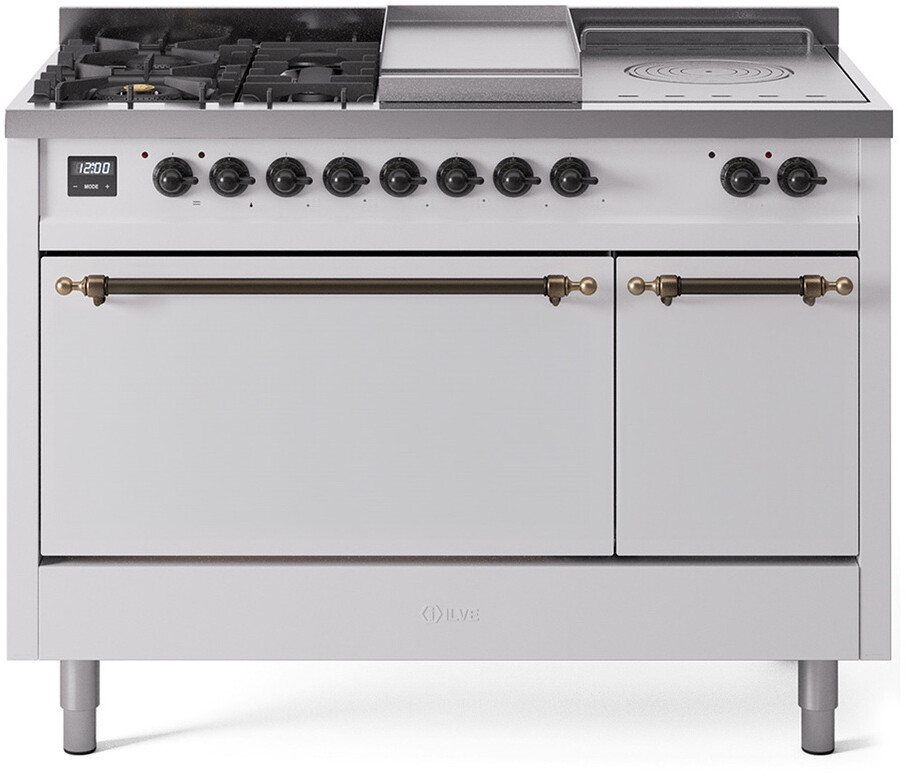 Freestanding Dual Fuel Range with 5 Sealed Burners, 5.02 cu. ft. Total Capacity, Storage Drawer, Griddle, and French Top: White, Bronze Trim, Solid Door. Enjoy versatile cooking options with five sealed burners that provide precise control and even heat distribution for all your culinary needs. Cook multiple dishes at once with the spacious 5.02 cubic feet oven capacity, perfect for large family meals and entertaining guests. Keep your kitchen organized with the convenient storage drawer, providing easy access to pots, pans, and cooking utensils. Expand your cooking possibilities with the included griddle, ideal for preparing pancakes, eggs, and grilled sandwiches. Experience gourmet cooking with the French top, offering a versatile surface for simmering, searing, and sauting. With power up to 25000 btu as standard. Optimal supply and perfect distribution of the heat, for all types of cooking. With non-stick nanotechnological treatment. The noble technical characteristics of brass are enriched with a nanotechnological coating that assures easy cleaning, with an elegant Total Black finish. Structure in AISI 304 steel with 12/10 thickness, option to choose the ideal combination between a gas hob with up to 9 burners or induction, mixed and in various setups. The indestructible cast iron pan supports provide a functional and safe support for the pots. The electronic control ensures that the temperature of the oven remains constant throughout, without fluctuating, as is the case in conventional ovens. It can be set with precision starting from 85F, for perfect proofing, up to 575F, for roasting. The door hinges are fitted with a shock absorber that makes the closure more gradual and noiseless. The quick oven preheating function allows it to reach the desired temperature in a short time and you can then choose the best-suited cooking mode for the dish. It also works as rapid defrosting when a low temperature is set (85F 105F). The grease does not stick to the surface and can therefore be cleaned more easily. Pizza function. Quick start. Multiple fan cooking. Intensive cooking. Fan grill cooking. Grill cooking with closed-door. Cooking from above. Cooking from below. Static normal cooking. Grill cooking with closed-door. Cooking from above. Cooking from below. Static normal cooking. Series: Nostalgie II. Noblesse Frames: No. Fuel Type: Dual Fuel. Gas Type: Natural Gas. Installation Type: Freestanding. Oven Total Capacity (cu. ft.): 5.02. Sabbath Mode: No. Number of Racks: 2. Drawer Type: Storage Drawer. Display Type: LCD Display. Timer: Yes. Cooking Probe: Yes. Rotisserie: Yes. Soft Close Door: Yes. Cooktop Configuration: 5 Sealed Burners + Griddle + French Top. Burner/Element Type: Sealed Burner. Griddle: Yes. Grill: No. Oven Control Type: Knobs. Oven Door Type: Solid Door. Number of Ovens: Double Oven. Main Oven Capacity (cu. ft.): 3.5. Second Oven Capacity (cu. ft.): 1.52. Oven Cleaning Type: Easy Clean Enamel Cavities. Main Oven Type: UOV 80 M. Second Oven Type: UOV 30 E. ADA Compliant: No. Star-K Certified: No. Voltage: 240 V. Amps: 25.8 A. Exterior Width: 48". Width: 47 7/8". Depth: 27". Height: 36 1/4" - 38 1/2".